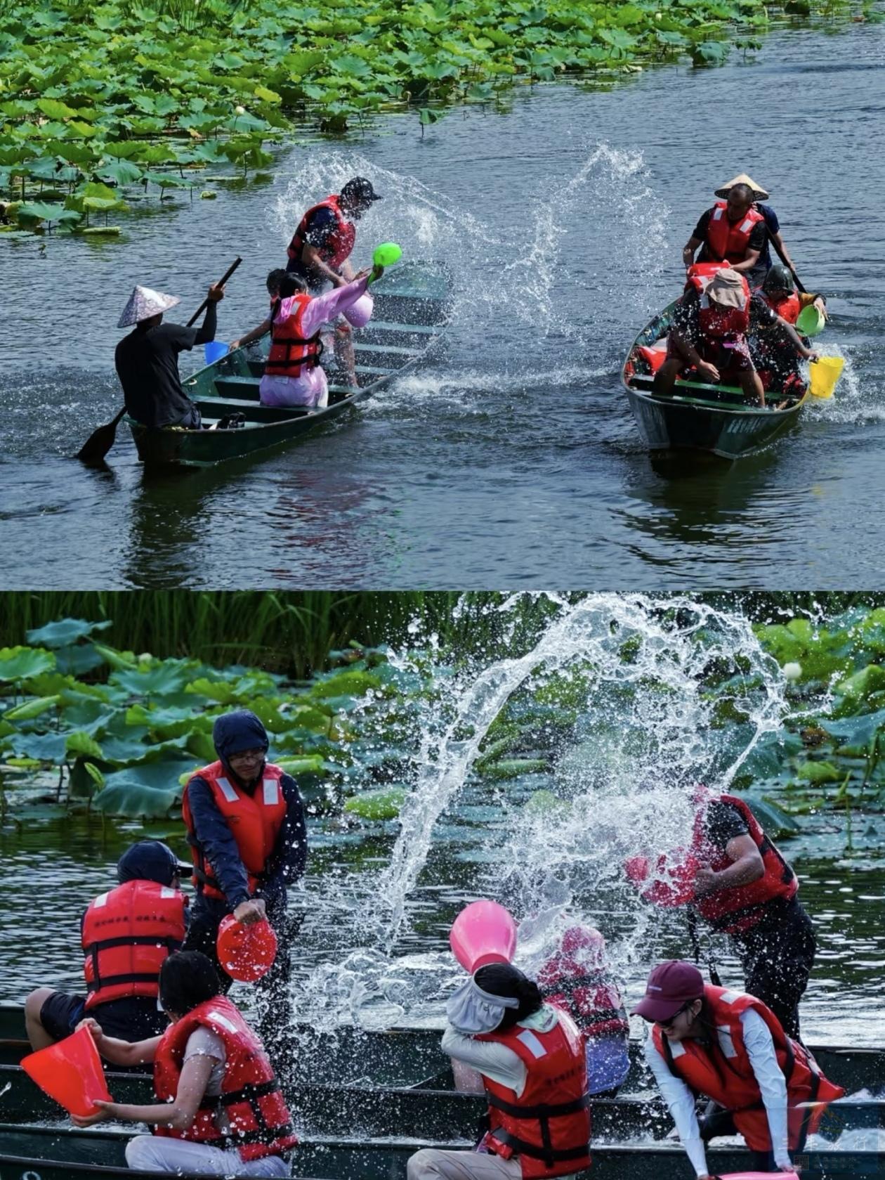 泛舟普者黑湖中,天气好就打个水仗吧,这早已是不成文的约定,如果是有备而来,一定会带上凉拖和手机防水袋(6-10月适合湿身,其他时间就要老老实实坐船了哦。)