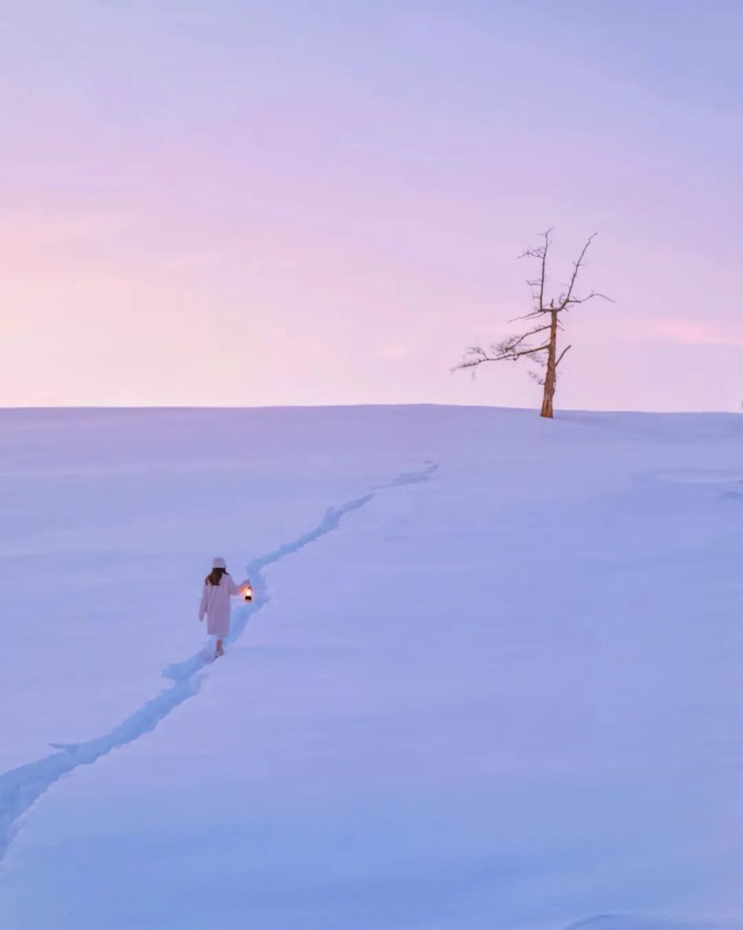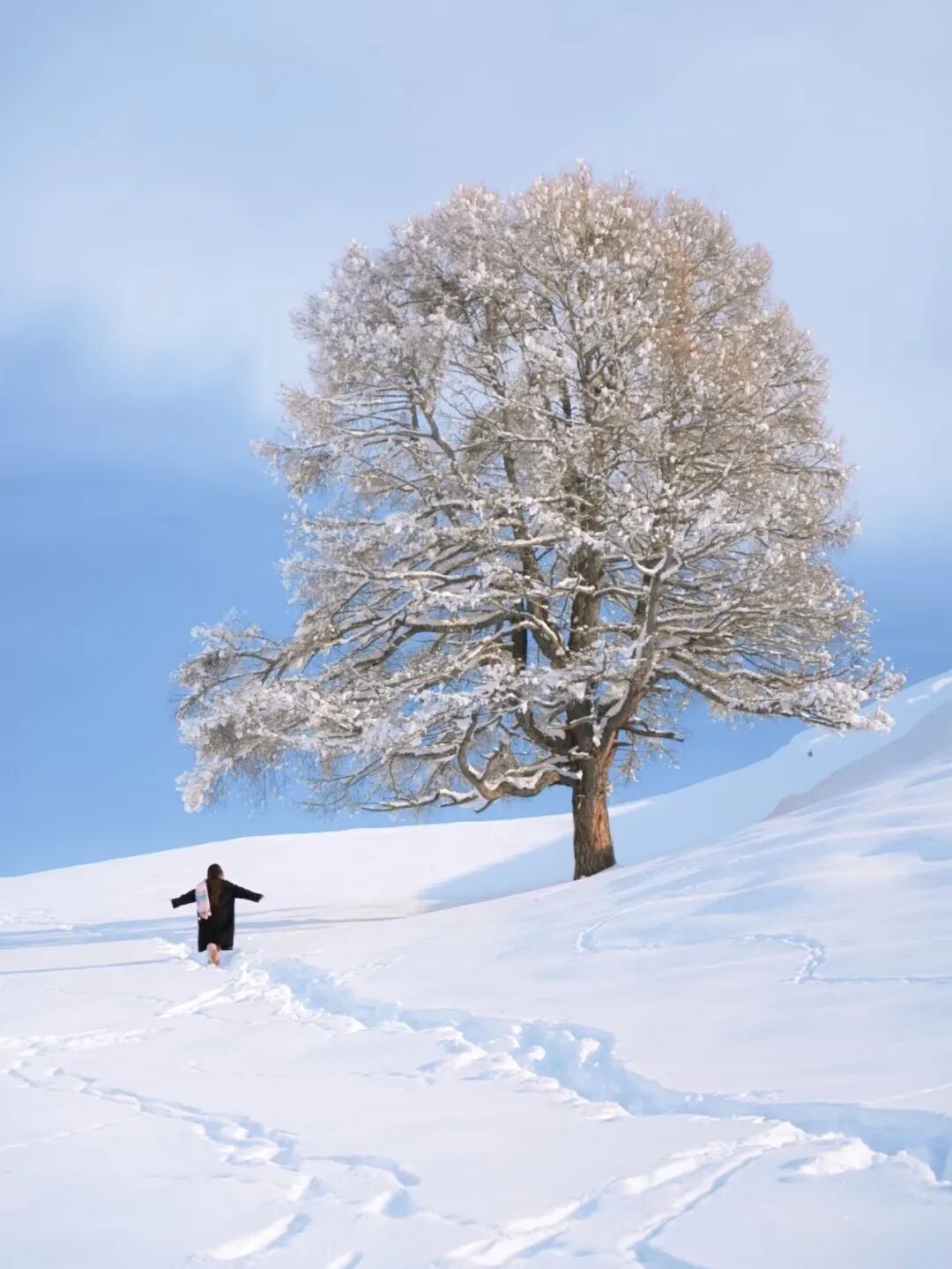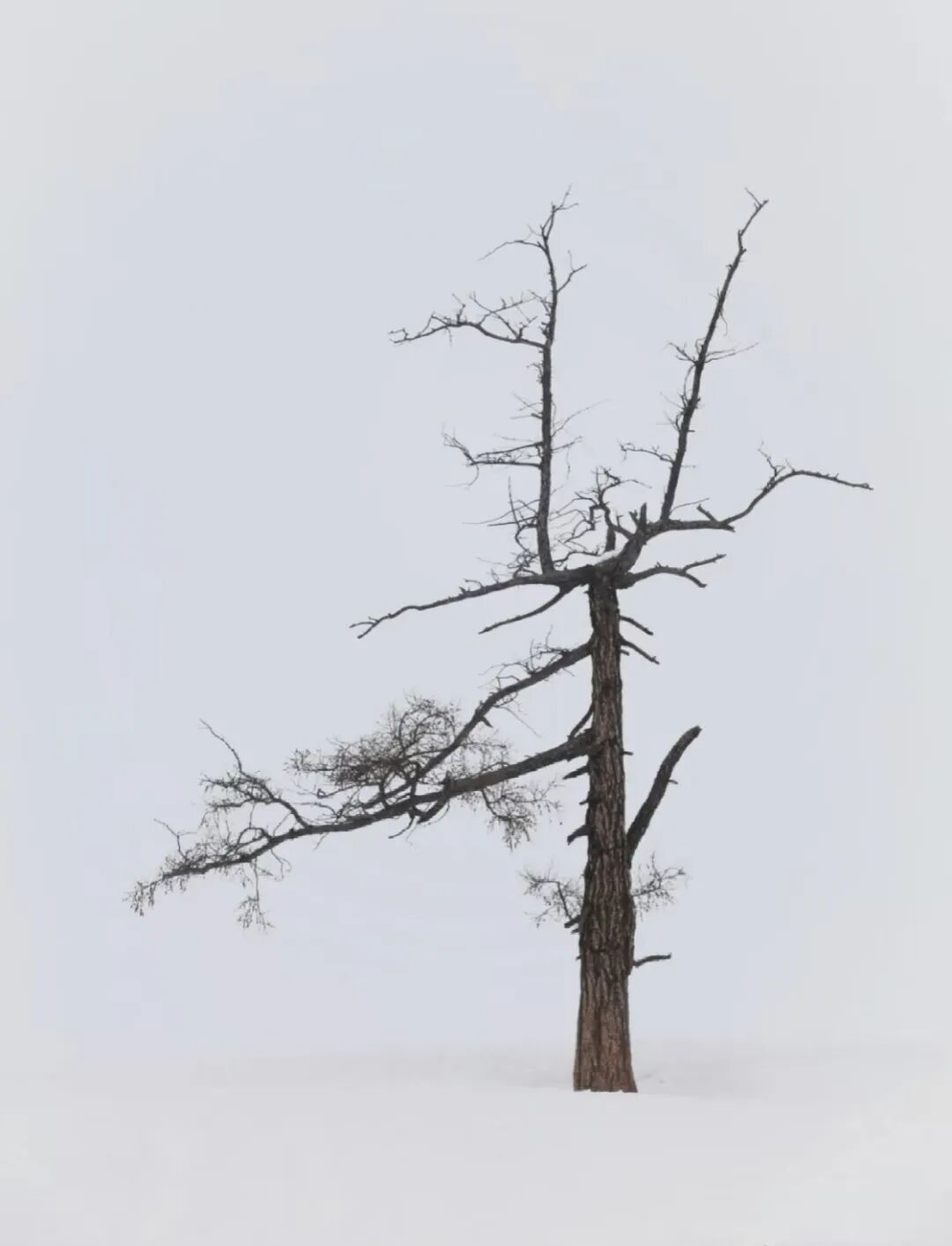 它独自站在茫茫雪原中,枝桠挂满雪絮,像在等待,又像在守望。