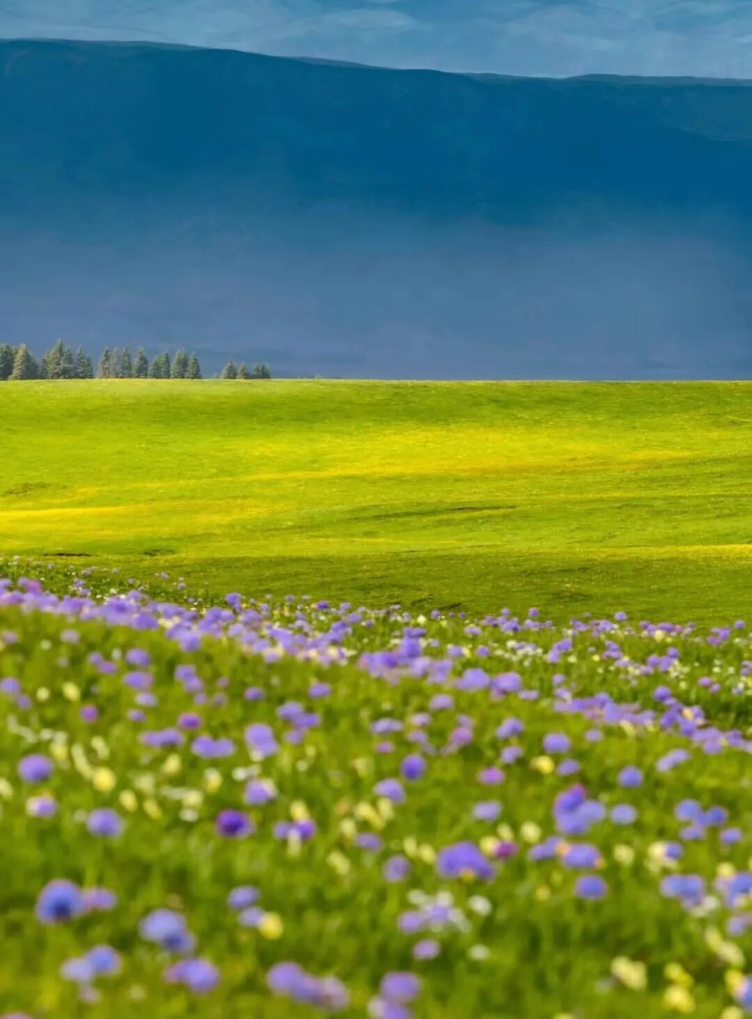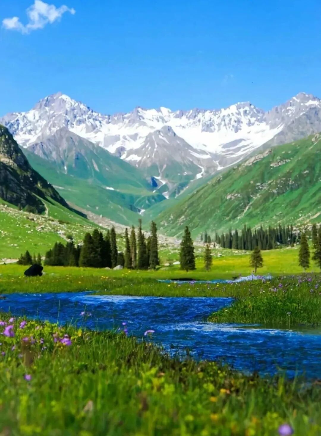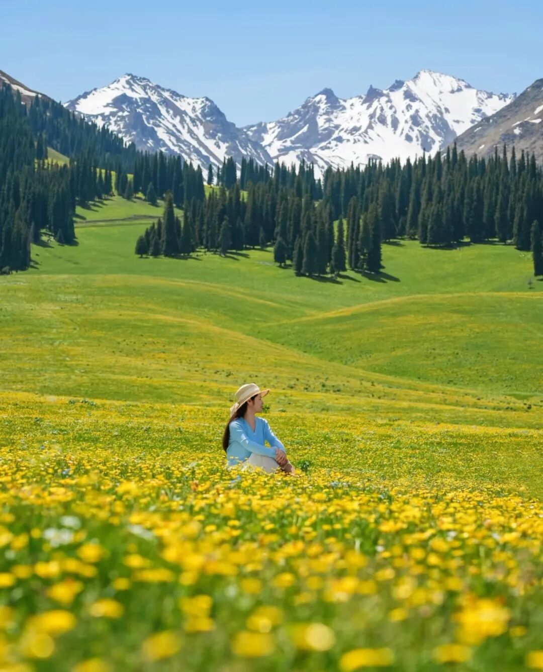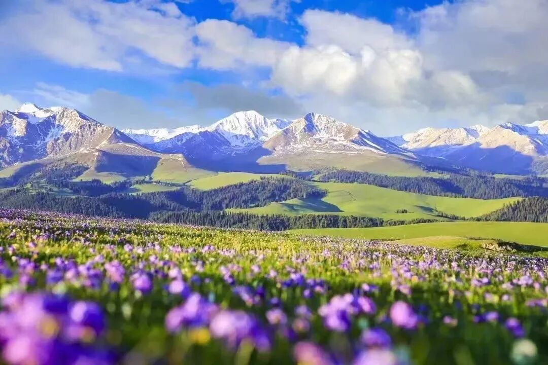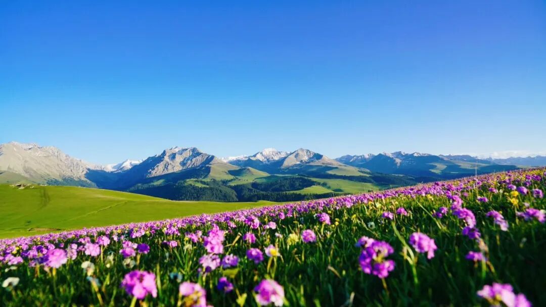 当5月的春风拂过天山腹地,伊犁便美成了人间仙境—雪山未融,草原铺绿,野花缀坡,蓝湖映天,此时正是伊犁游玩的最佳时节!