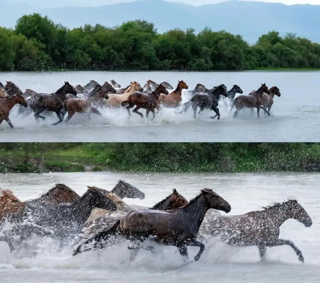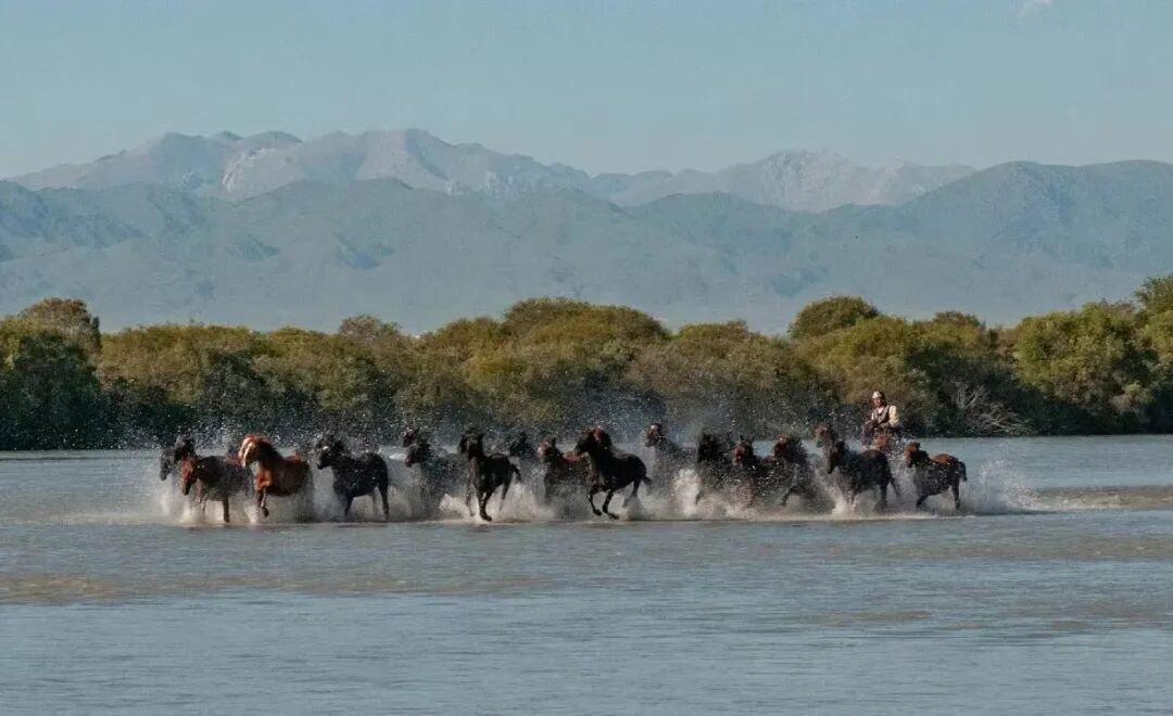 我们将在这里欣赏一场震撼的“天马浴河”,在广袤天地间,感受呼啸而过的生命张力。数十匹天马挣脱束缚,昂首奋蹄闯入河中,鬃毛翻飞如墨,蹄尖踏碎水面,溅起数米高的银花,水声、蹄声、嘶鸣声交织,磅礴气势直击心底,这便是独属于昭苏的野性震撼。
