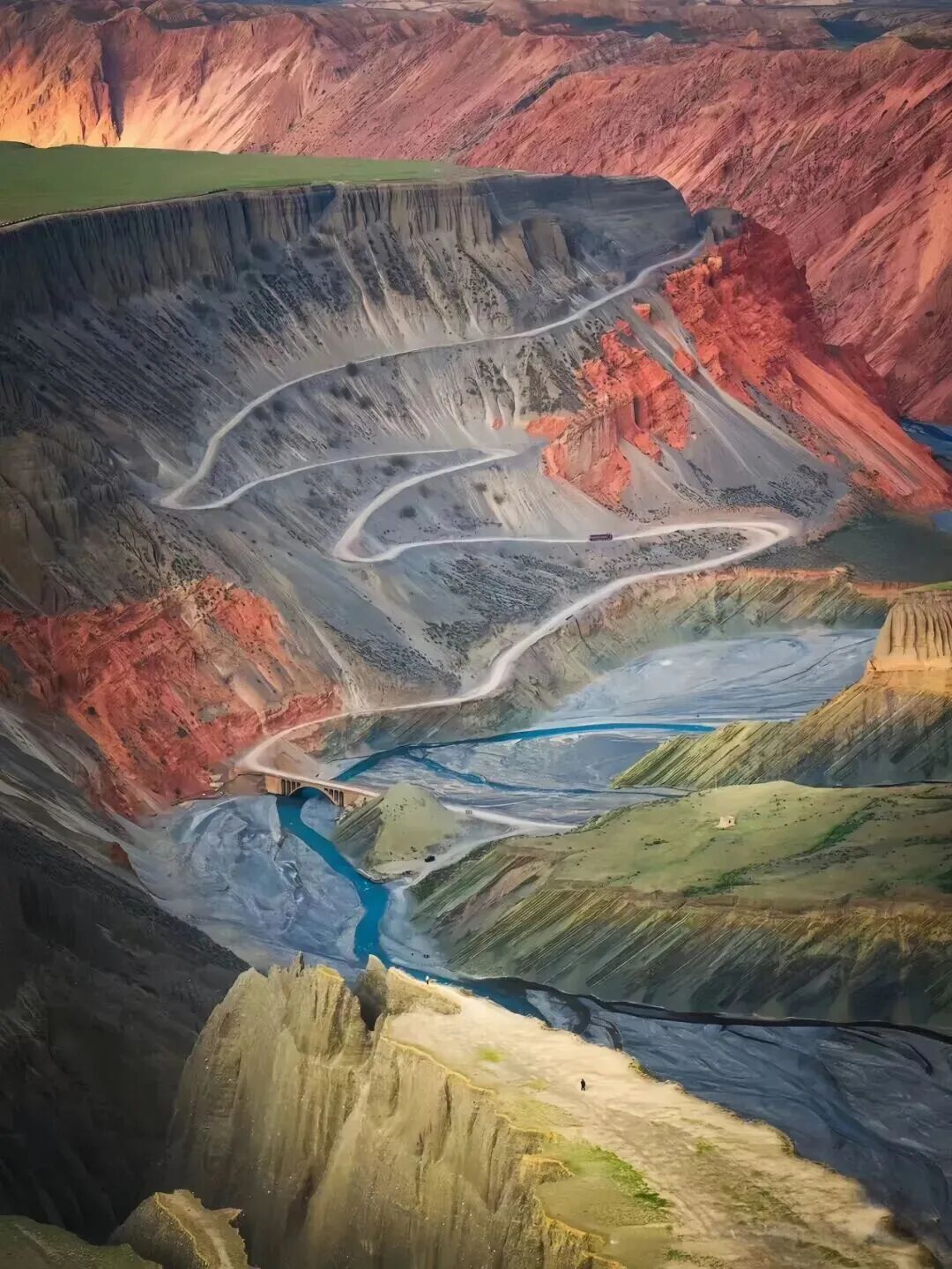 因岩层富含不同矿物质,峡谷呈现出红、黄、蓝、绿、褐等斑斓色彩,如同一幅泼洒在天山脚下的抽象油画。谷底,辫状水系蜿蜒穿梭,河水时蓝时灰,与彩色崖壁交相辉映。这里尚未过度开发,保持着原始野性。险峻的地貌、绚丽的色彩与远处的天山雪峰相映成趣,被誉为“中国的科罗拉多大峡谷”,是摄影与探险爱好者的向往之地。
