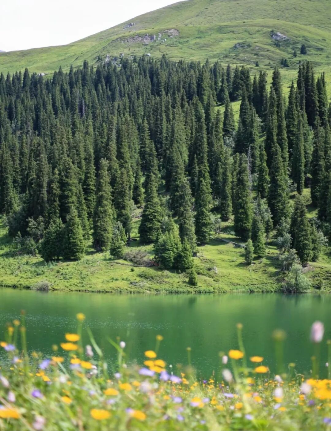 环湖一周约92公里,无论从哪个角度望去,都是一幅完美的画卷——北岸是连绵的雪山,南岸是起伏的草原,西岸是茂密的云杉林,东岸则是可以近距离戏水的砾石滩。