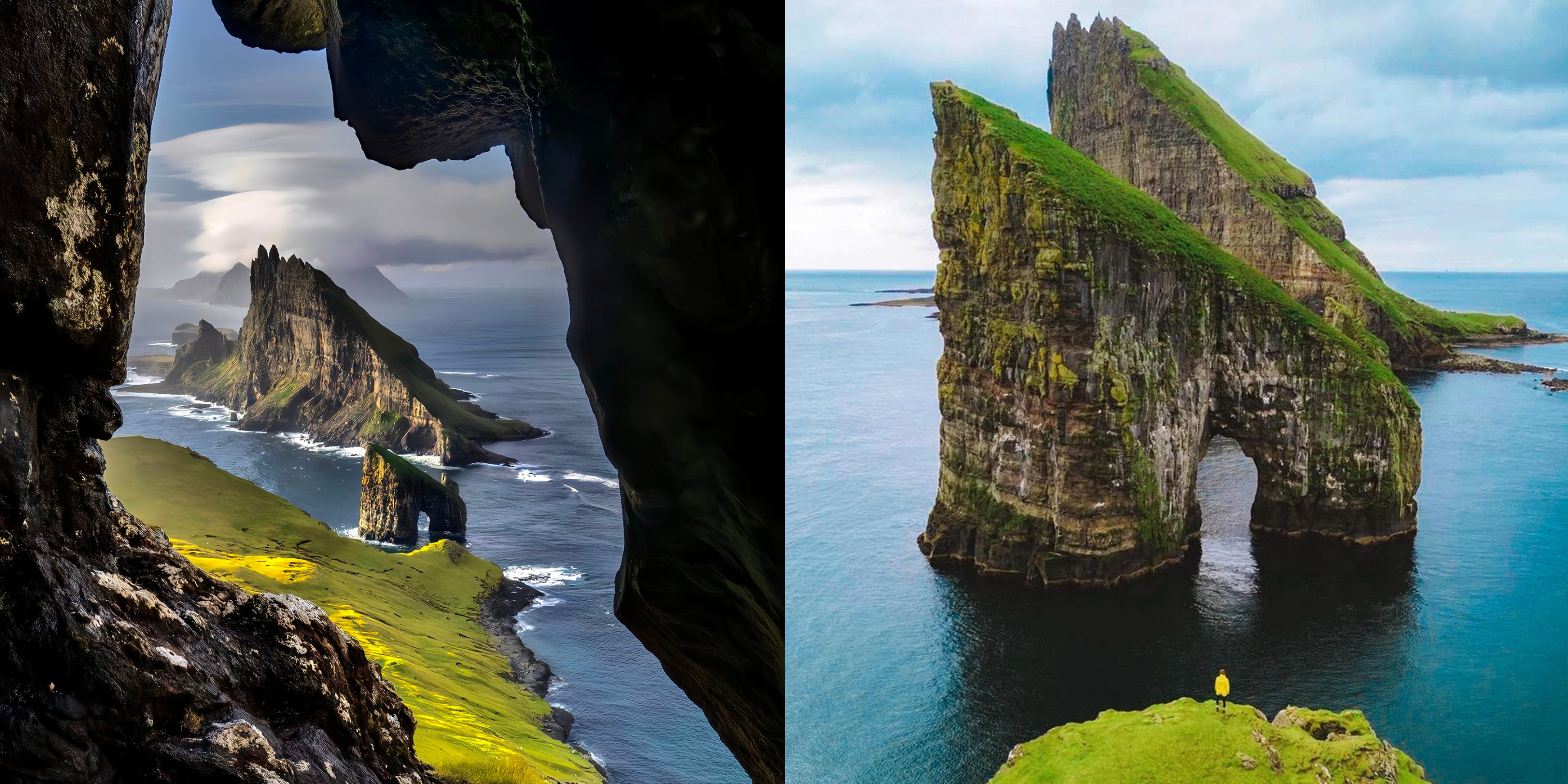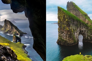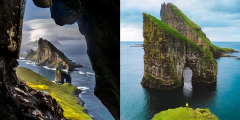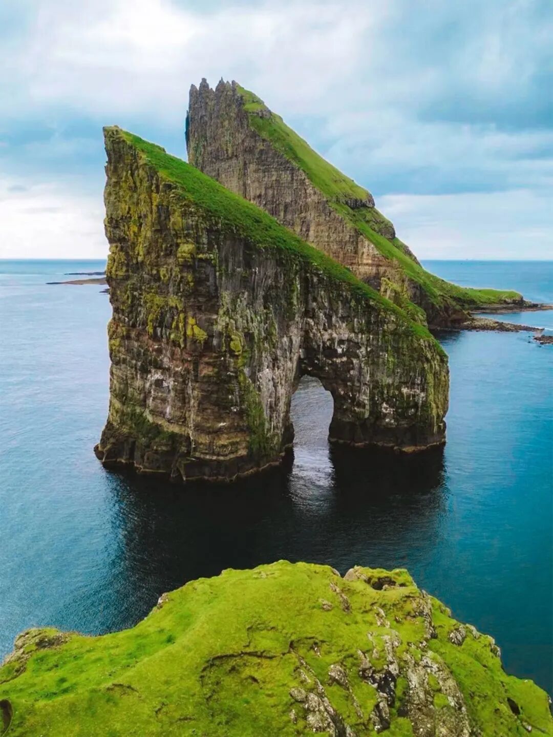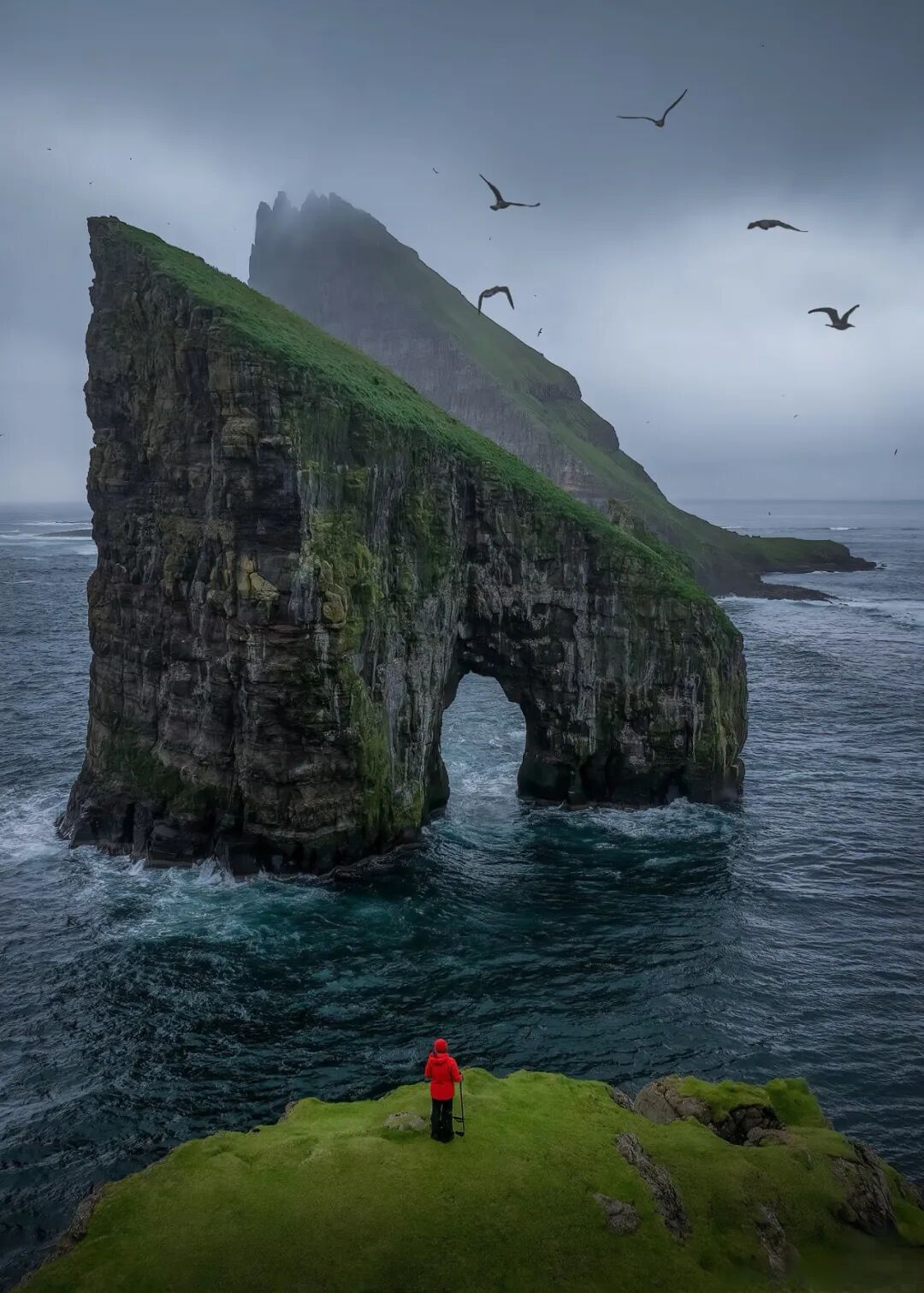 在瓦格岛和斯特莱默岛之间的海峡中,两座突兀的海蚀柱高达70米,静静矗立在汹涌的北大西洋中,这便是法罗群岛最具标志性的景观之一:达兰加尔门(Drangarnir)。