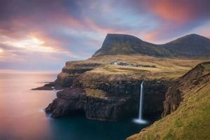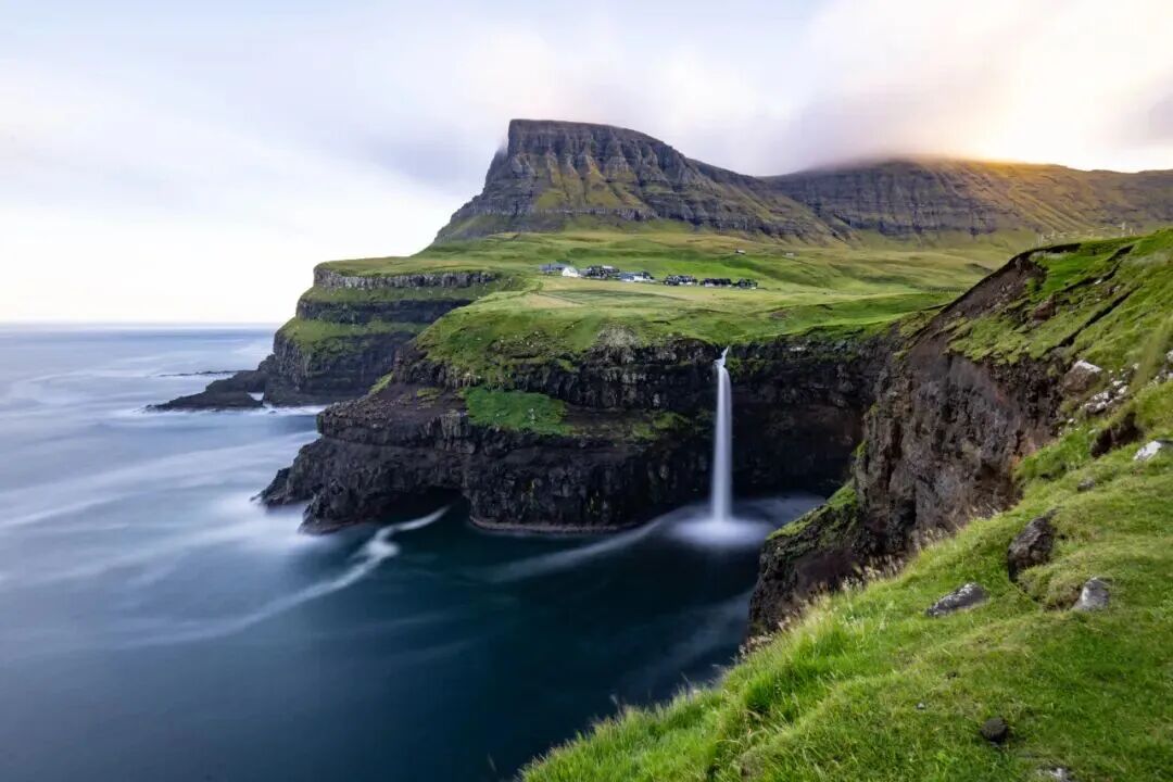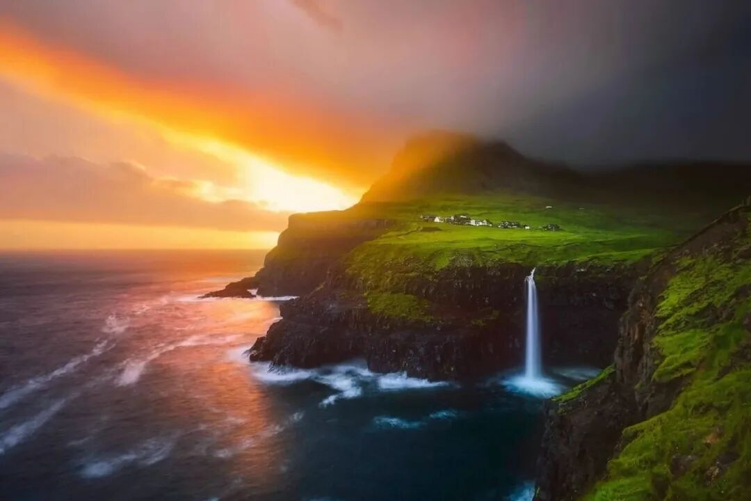 穆拉福苏尔瀑布(Múlafossur),又称海角瀑布,位于瓦格岛西岸的加萨达勒村(Gásadalur),被誉为“全世界最美的入海瀑布”。