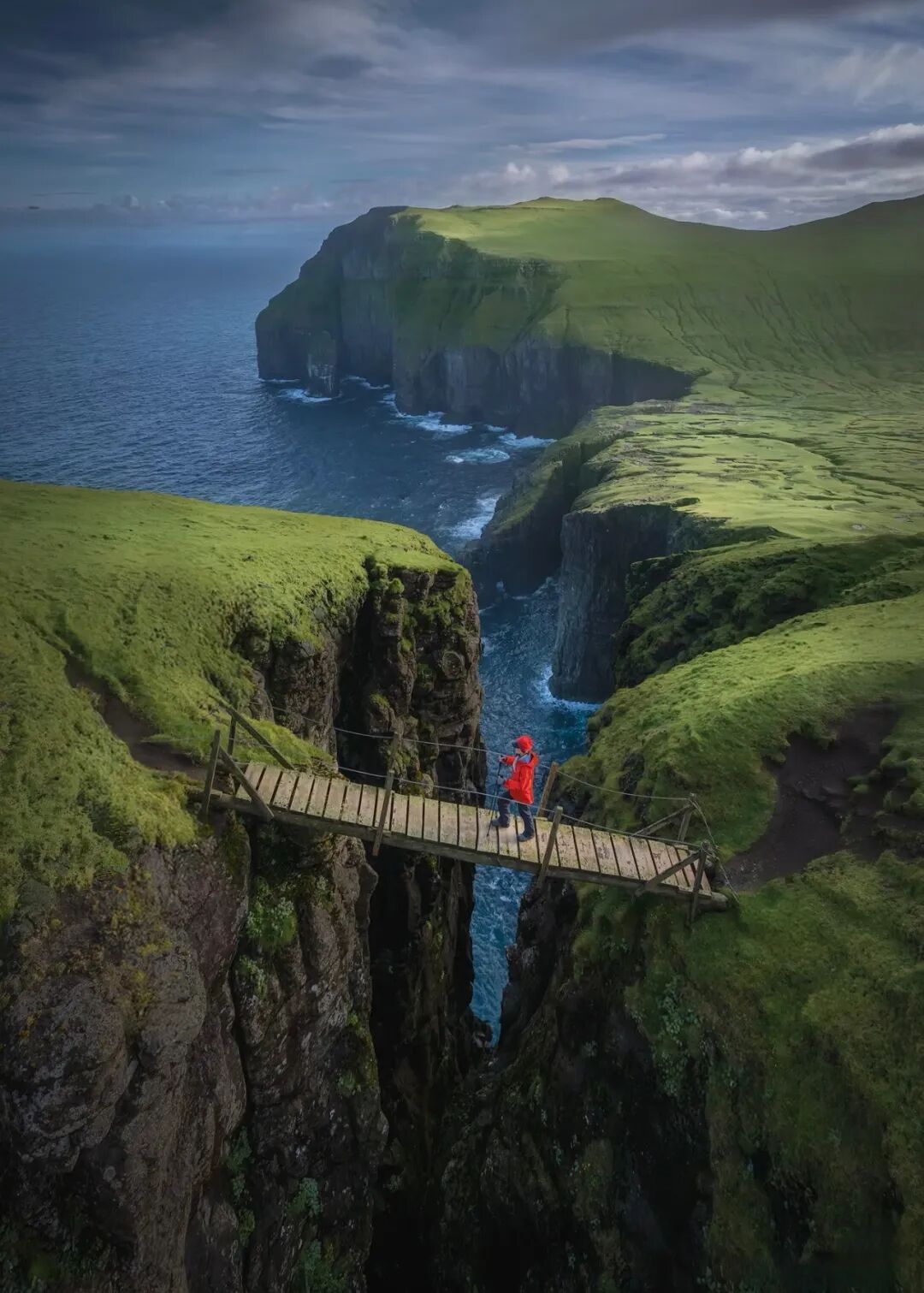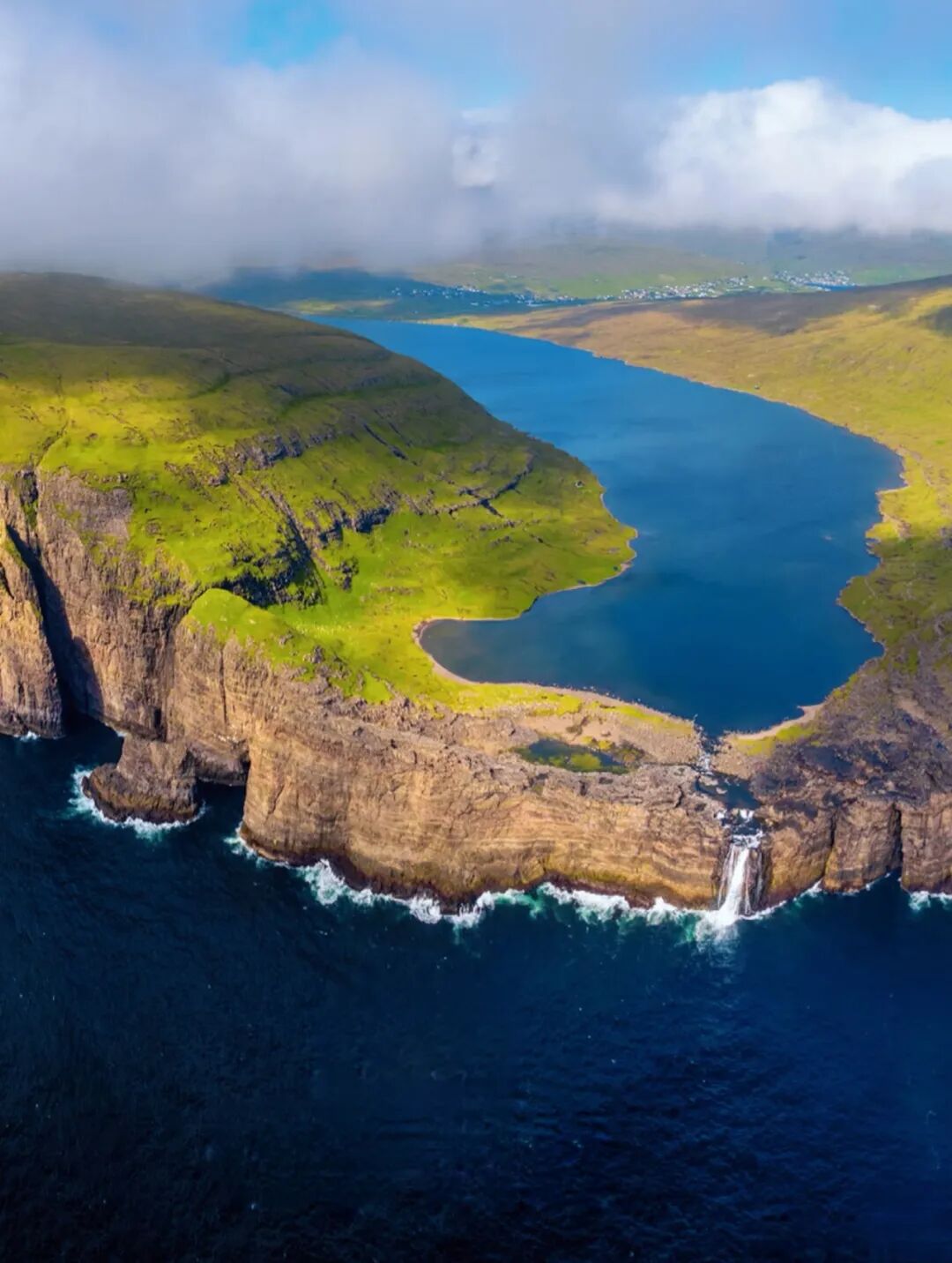 在法罗群岛的瓦格岛(Vágar)西侧,藏着自然界最神奇的视觉把戏之一Sørvágsvatn湖。当远眺时,湖水诡异地悬浮在北大西洋上空,形成一道令人屏息的奇观。