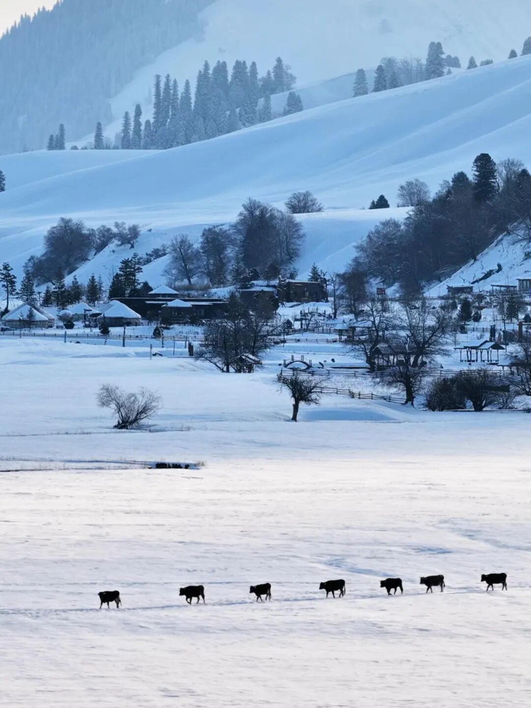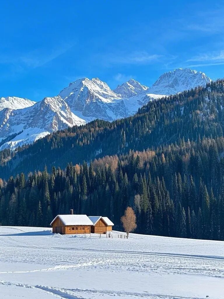 这里没有喧嚣,只有木屋、雪岭、森林和牧场,构成的极简线条,它比任何北欧图片都更宁静、更真实,是深藏于天山脚下的秘境童话。