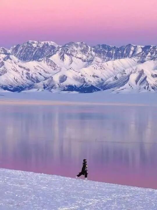 当赛里木湖进入冬日的序章,冰封的湖面便成为奇幻的舞台。等待着日落时分,天际染上梦幻的粉紫色,整个冰湖便瞬间温柔,仿佛宇宙尽头才会出现的绝美之境。