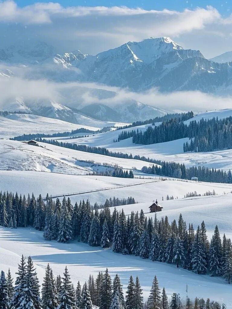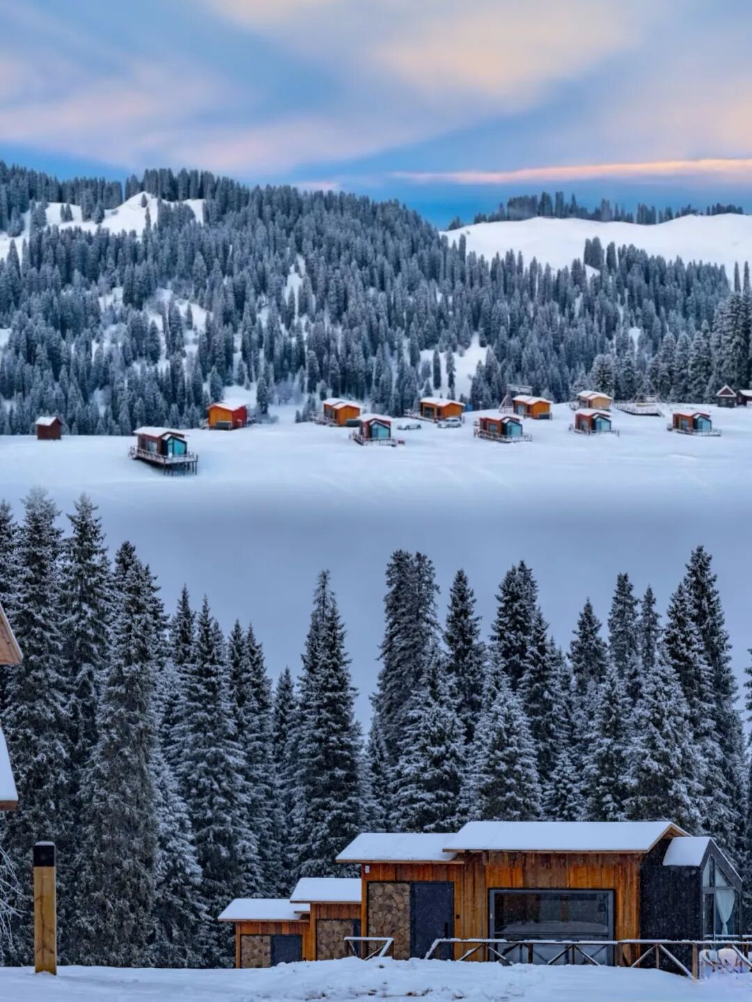 雪后的库尔德宁,是一片银装素裹的隔世仙境,整座山谷被纯净的白雪温柔覆盖,近处云杉静立,远处雪峰巍峨。暖黄的灯光在清冷的雪色中点亮,像童话里的小屋,出门几步,随手一拍都是冬日大片,足以安放所有浮躁。