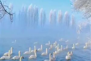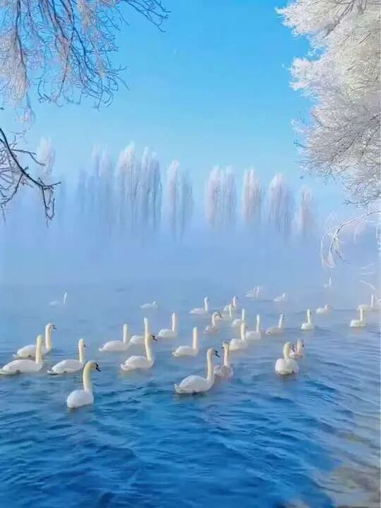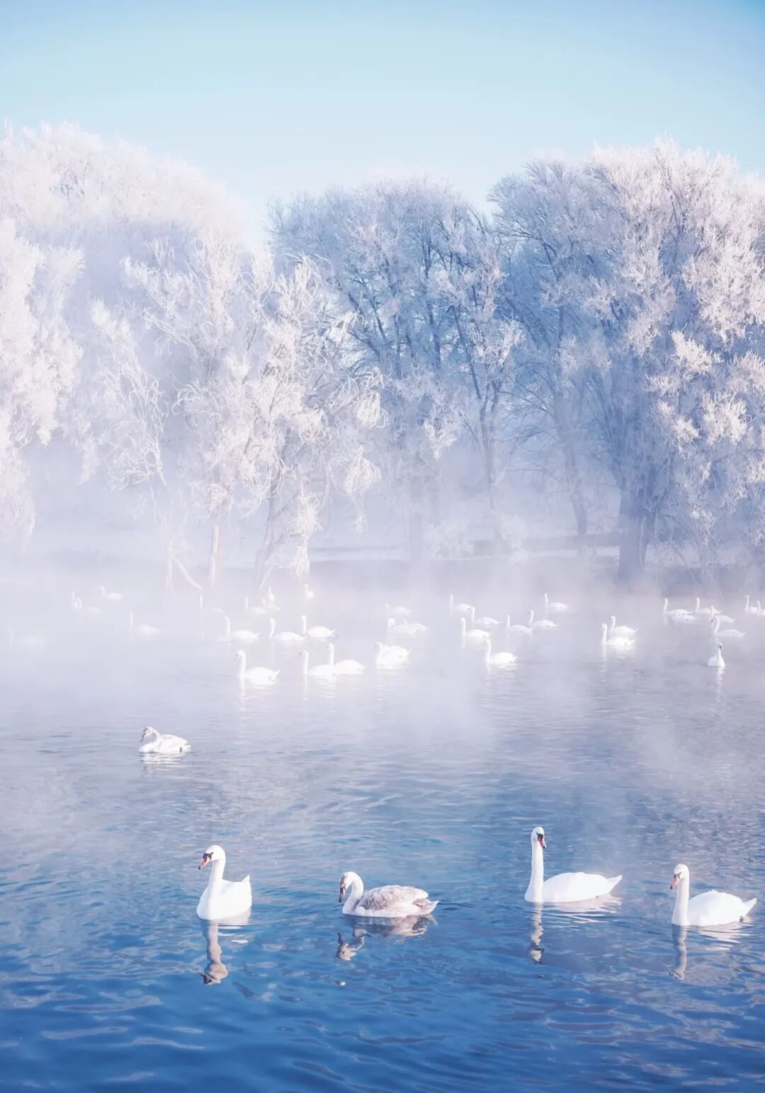 天鹅泉是新疆最大的天鹅越冬栖息地之一,每年冬季,大约有300只天鹅在此越冬,其中90%为珍贵的疣鼻天鹅,其余为大天鹅。独特的气候环境和水汽,使得天鹅泉常常能看到树挂,晨雾中的天鹅与雾凇融合在一起,美如仙境。