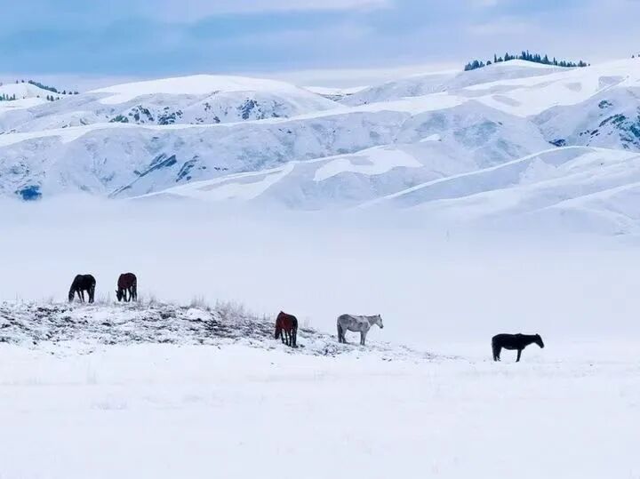 那拉提,哈萨克语意为“最先见到太阳的地方”。这片天山腹地的空中草原,冬季化身为银装素裹的雪域仙境。