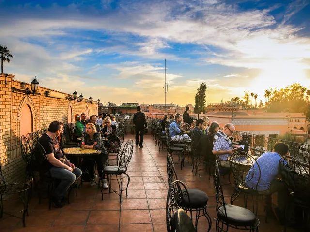 下午前往拍摄【不眠广场】(2小时):从日落到深夜,你有机会看到印度的舞蛇人(广场有些摆拍需要额外收取小费)、出售香料茶叶的阿拉伯人、讲故事和算命的摩洛哥老人,各种卖艺的表演,还有数不清的买卖食品、饮料、服饰、地毯、摆设、皮革、手工艺品小摊位,它就像香港的兰桂坊、上海的新天地一样,因为有此广场,马拉喀什有了无穷生命力,自由扫街购物!(前往广场对面的咖啡光二层露台点一杯咖啡,是拍摄广场全景的最佳位置)