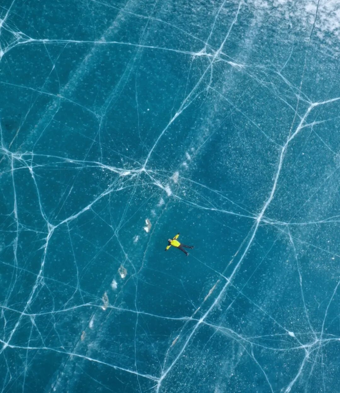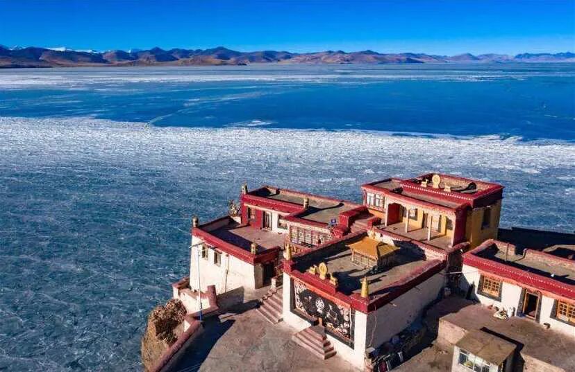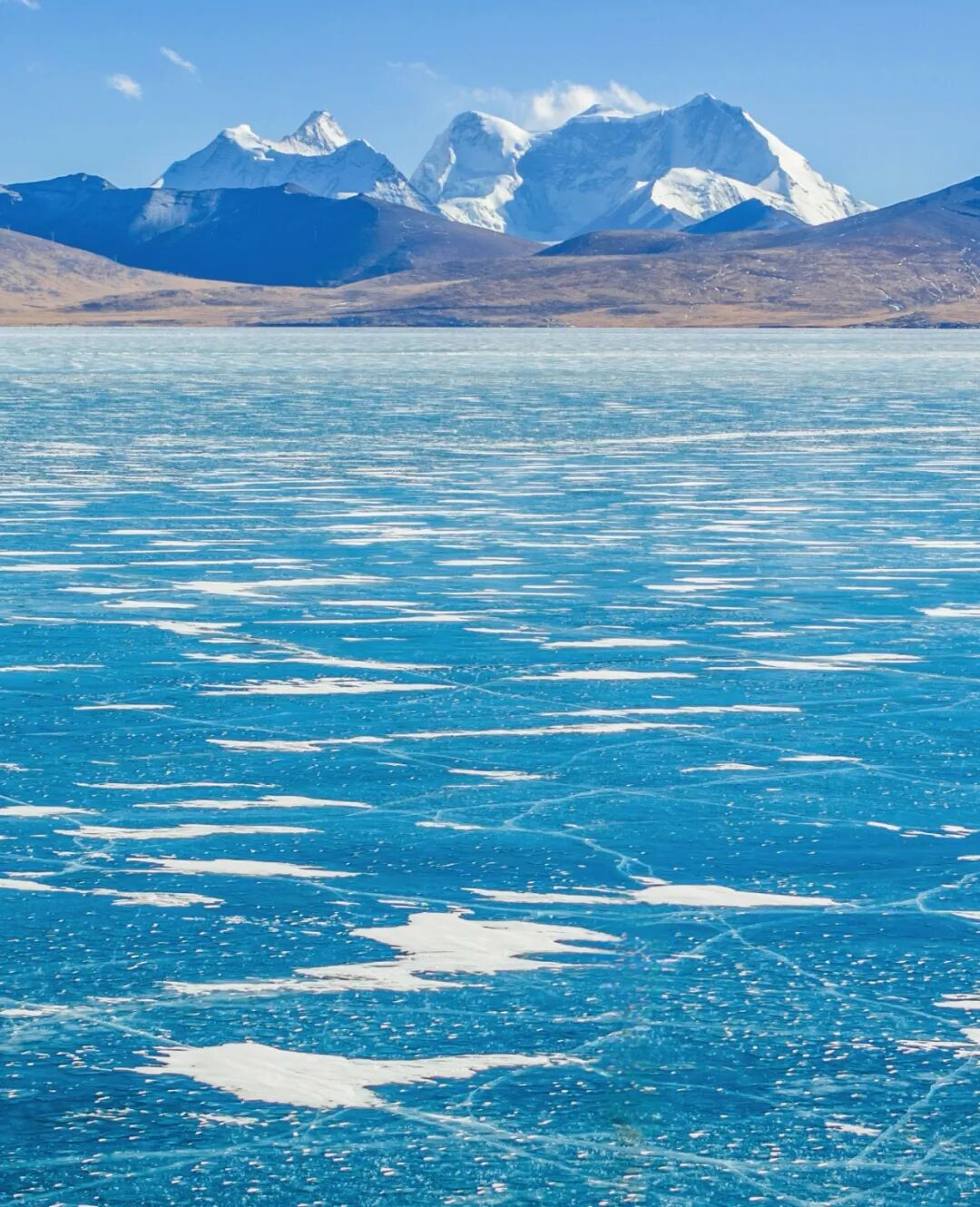冬季的普莫雍措会结起厚厚的冰,如同被遗弃在地球上的一块巨大蓝宝石,碎裂的纹理里散发着别样的瑰丽。