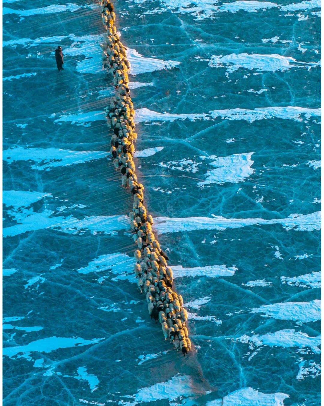为了安全度过枯草季节,在最寒冷的二月,推村村民把羊群集中送到普姆雍措湖心岛上,享受一个月肥美的嫩草。一个月过后,融冰之前,穿过厚厚的冰面,村民把羊群重新接回村里,这一传统在这片土地上已经延续了上千年。