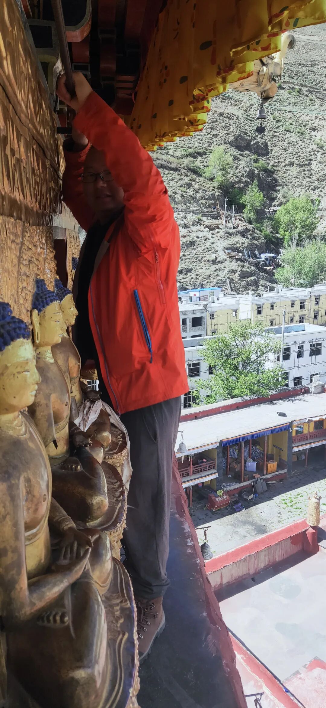 这座高达28米的传奇九层佛塔,一进色乡就能看到,号称藏地“最惊险的转经道”,最顶部外面就是转经道,但没有任何保护,你只能抓着固定在碉楼上的唯一一根拇指粗细的钢筋,小心翼翼地侧身缓缓挪动步子。