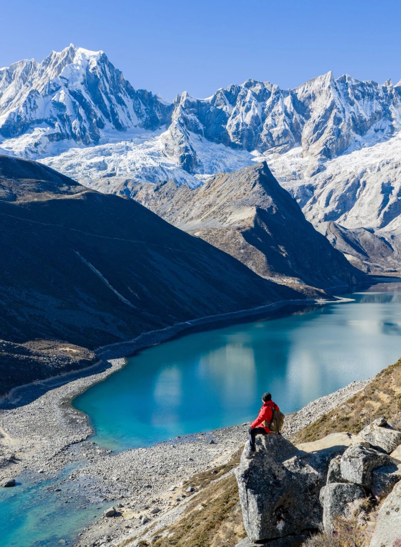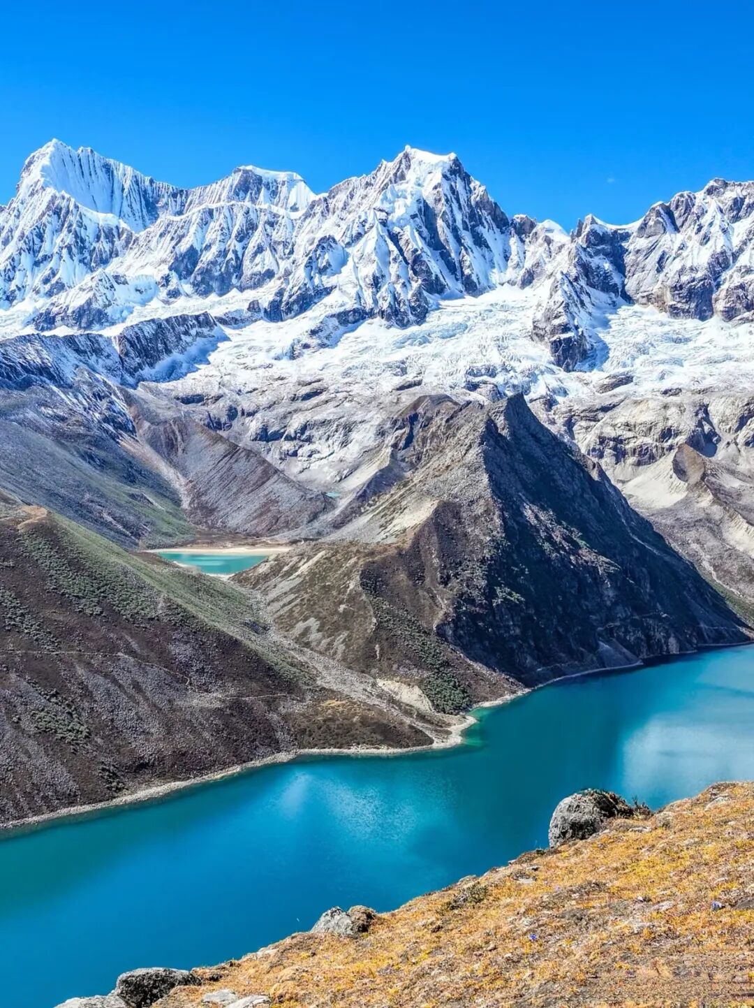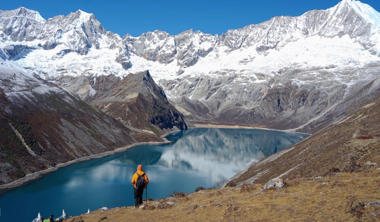 普莫雍措湖面海拔5010米,位于山南地区洛扎县和浪卡子县交界处,“普莫”为小姑娘的意思,“雍措”意为像碧玉一般的湖泊。普莫雍措被连绵的雪山所围绕,巍峨的“库拉岗日”神山就在湖旁。普莫雍措湖水湛蓝清透,湖中小岛犹如巨龟,静静地守护着这位“少女”。传说普莫雍措曾被莲花生大师所加持,从而有了神圣的气场。