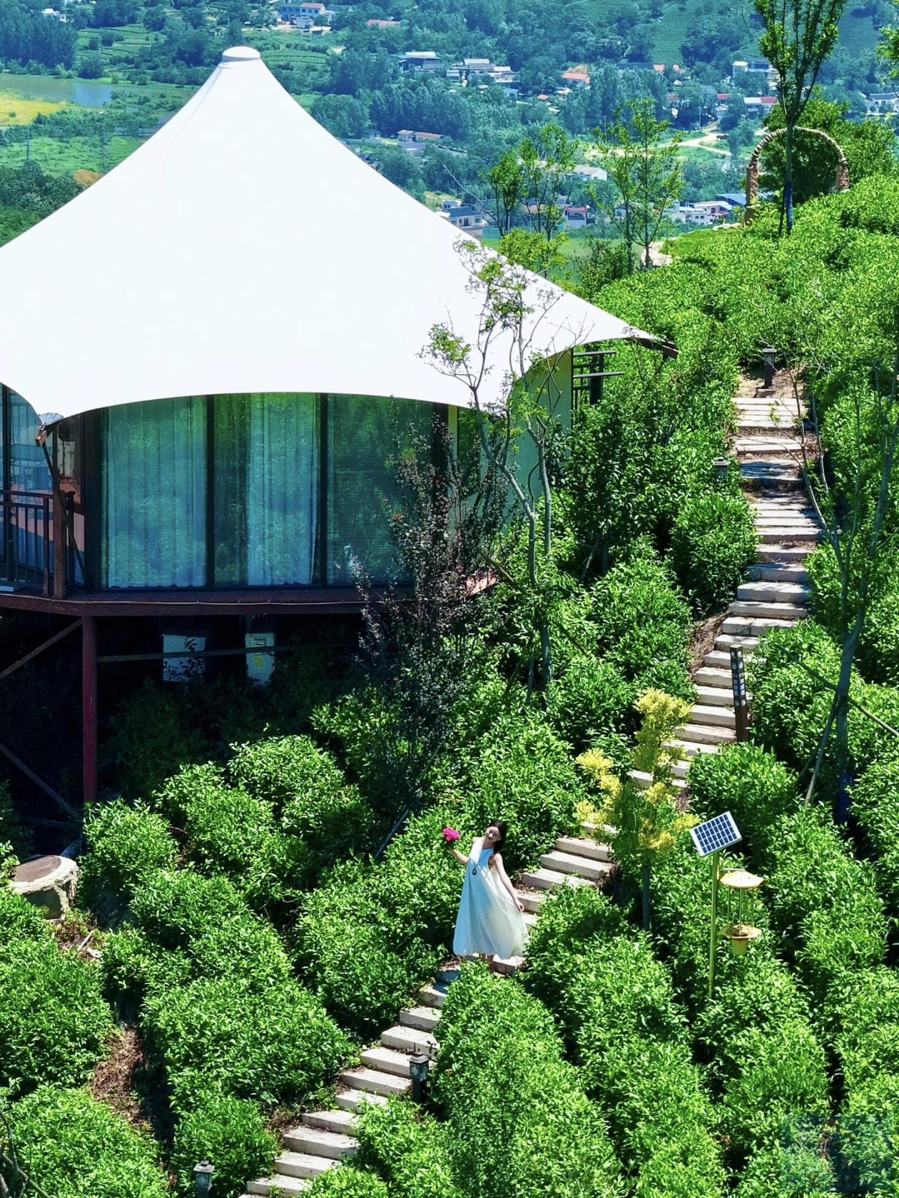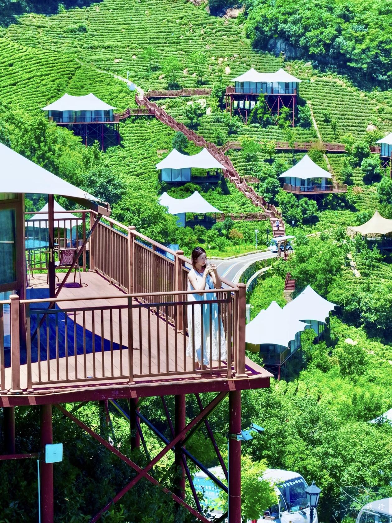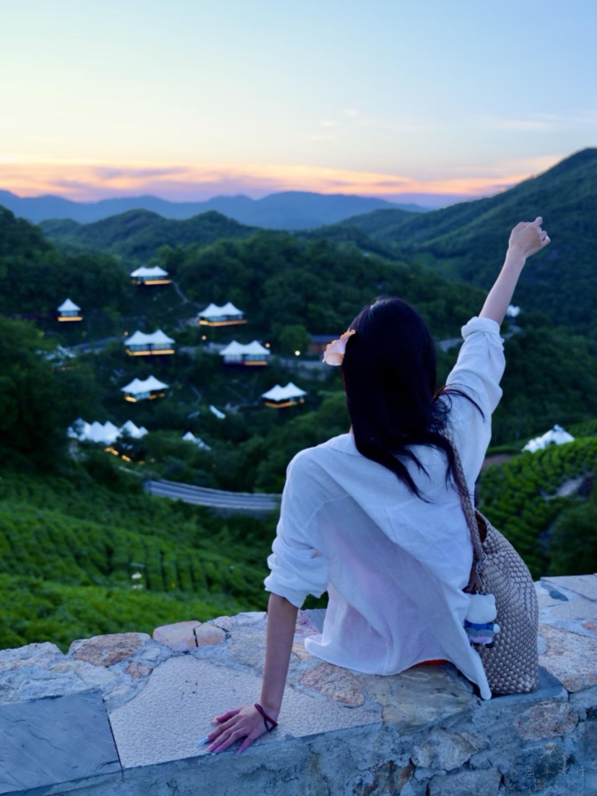 自由早起观看日出,推开窗户,窗外是一望无际的茶海,脚下是那一弯南湖,万亩茶林掩映在苍茫云海间,在蓝天的映衬下,看云时,山在云上,看山时,云在山间,宛如仙境。