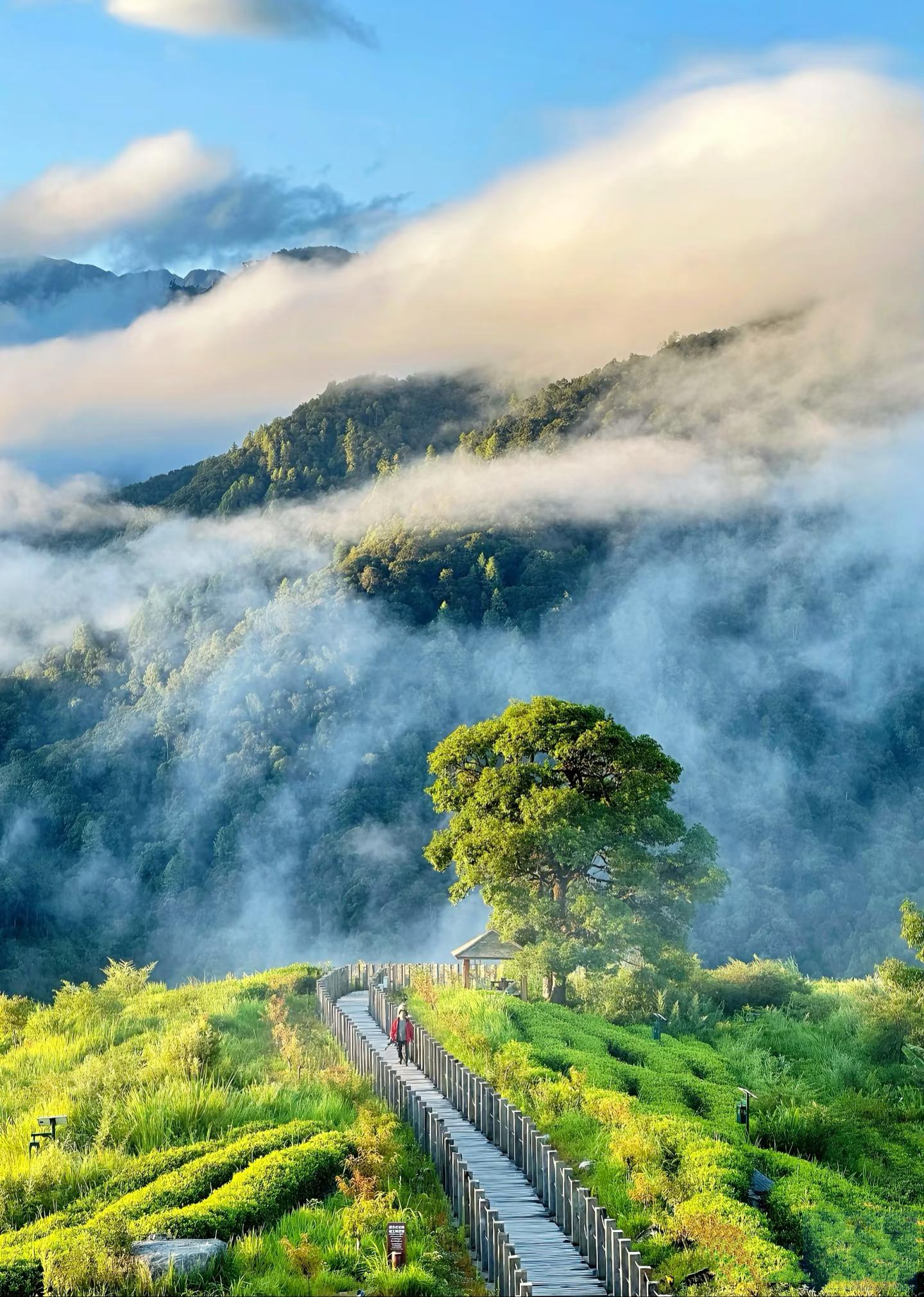 藏在云雾中的桃源村落,聚居着淳朴的门巴族村民,保留着原汁原味的民俗风情。村子海拔约1800米,境内的格林村缥缈茶园观景台,是俯瞰美景的绝佳去处,登台远眺,云海在脚下翻涌,成片的茶田顺着山坡层层铺展,翠绿的茶垄与远处的雅鲁藏布江峡谷、连绵峰峦相融,云雾漫过茶田时,整座村落仿佛漂浮在云端,仙气氤氲。村里的树王森林更是惊艳,作为全球保存最完整的原始雨林之一,这里生长着中国最高的不丹松“辛达布”,高达76.8米的树干笔直挺拔,枝叶舒展如伞,扎根在雨林深处,见证着岁月的流转