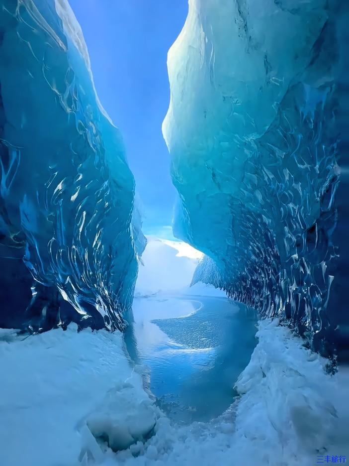 冰体带着亿万年沉淀的纹路,是时光刻下的年轮,浅蓝与乳白交织,似上帝打翻的调色盘,在荒原上铺展成静默的画卷。清晨的薄雾轻笼冰川,朦胧间分不清是冰是云,阳光穿透雾气洒落,冰面折射出细碎的光,温柔得像穿越千年的凝望。