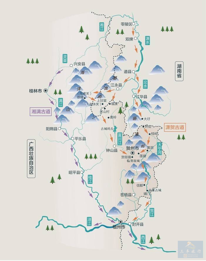 湘漓古道均为秦汉时期连接中原与岭南的重要交通要道,其中潇贺古道又名秦建新道,最初建成于秦始皇二十八年(公元前219年)冬,起于道州(今湖南道县),终于临贺(今广西贺州八步区)。