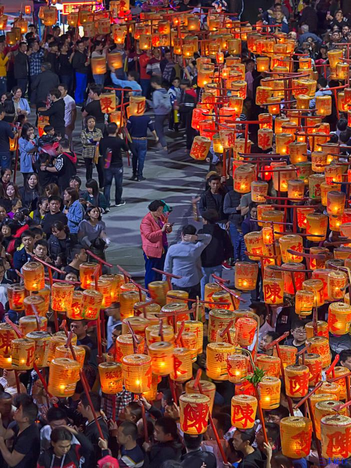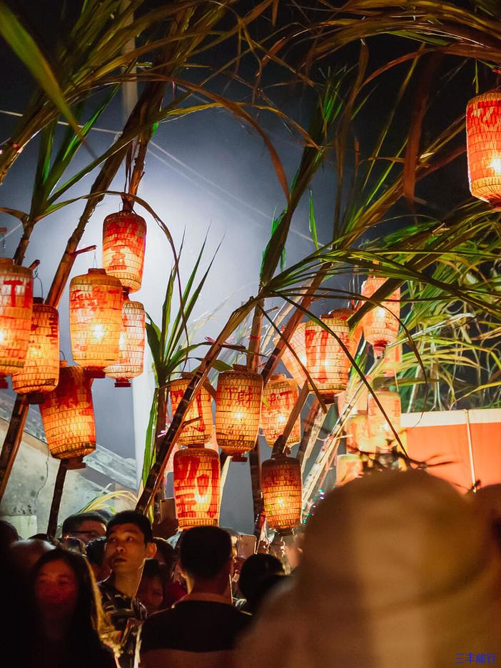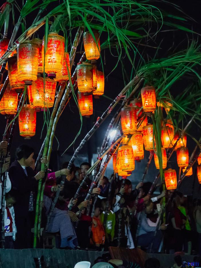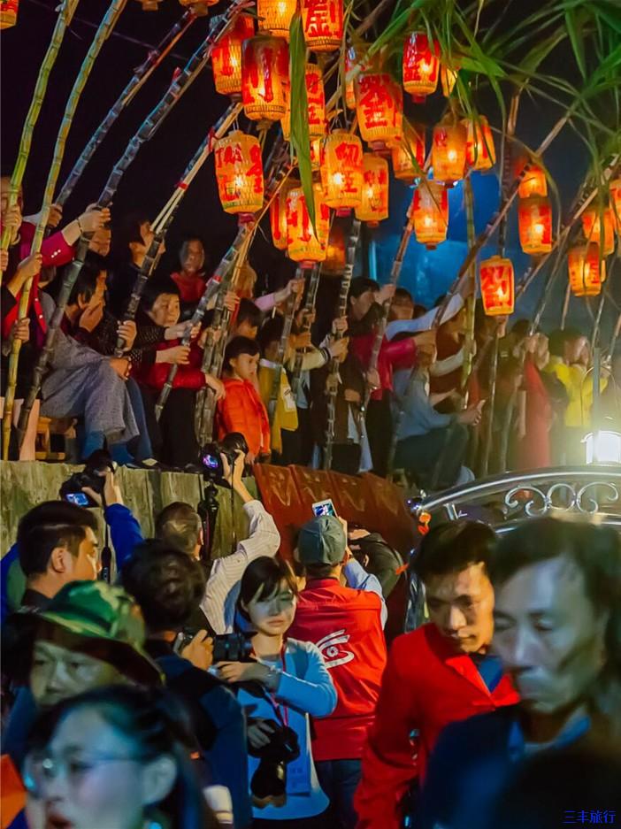 在队伍中间,还会有壮汉抬着当地神像,依次从道路两旁的“蔗灯”下走过,走街穿巷,为家族祈福