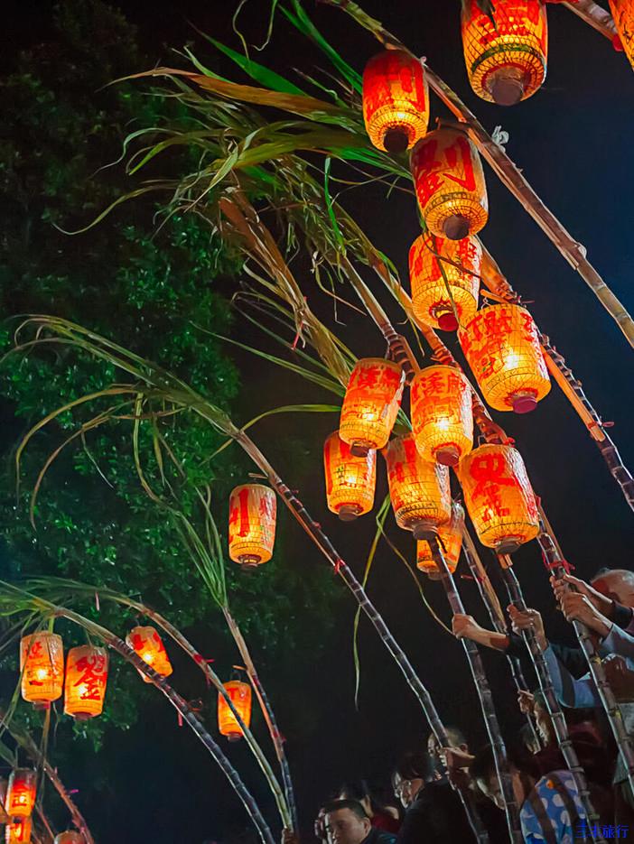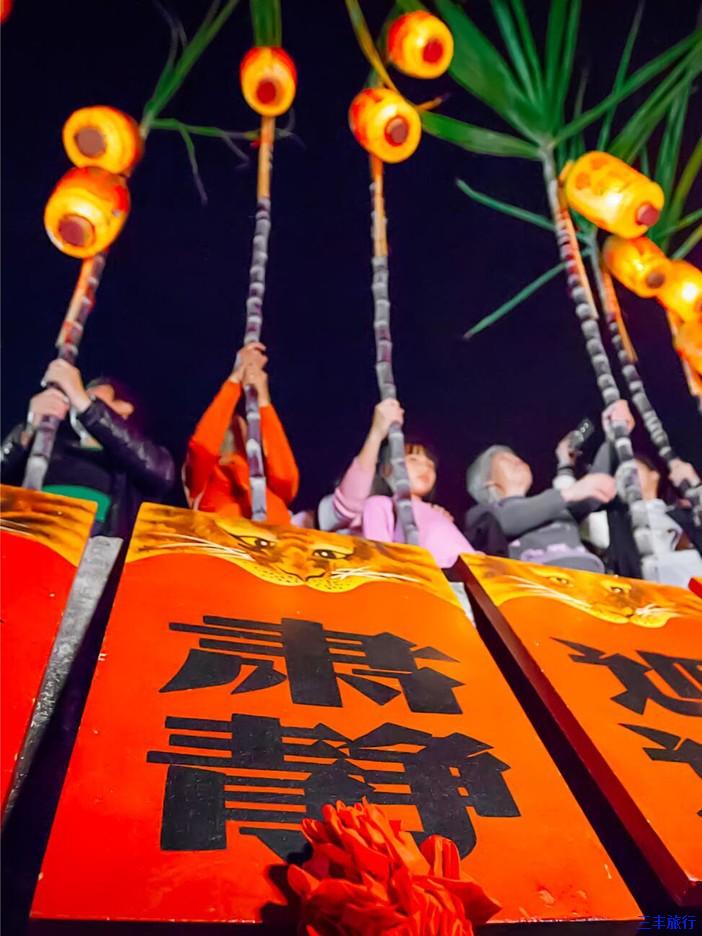 留着甘蔗尾叶的灯笼在路两旁伫立,只等待时辰一到,穿者打扮古装的游巷队伍开始启动,鞭炮齐鸣,锣鼓喧天,队伍最前方的朱红大牌匾上书“肃静”、“回避”等字样,后方紧跟着锣鼓队,锦旗队,花篮队等