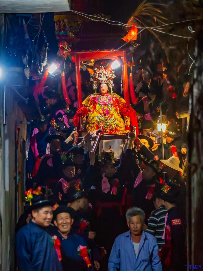 随着夜色降临,几声锣鼓鞭炮声响起从祠堂里抬着的各种神仙老爷开始游街,走街穿巷,好一个锣鼓喧天鞭炮齐鸣