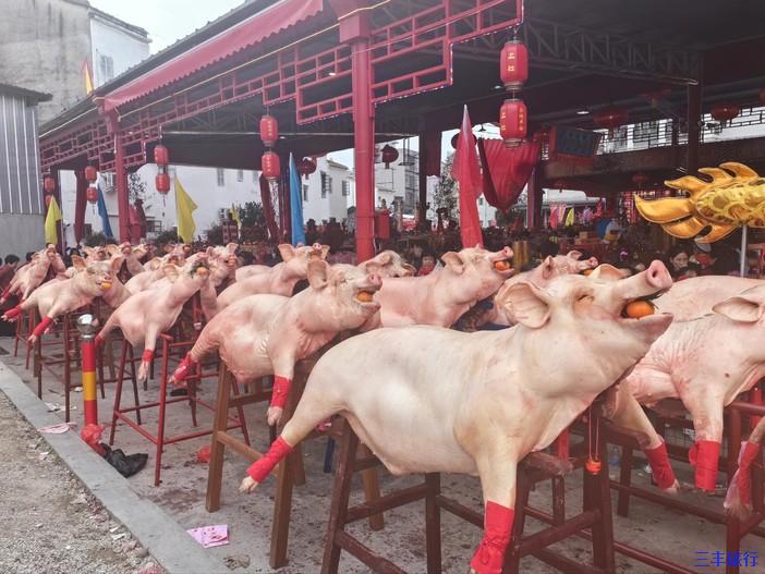 揭阳新亨镇的“摆猪羊”是一项具有悠久历史和深厚文化底蕴的民俗活动。每年的农历正月十六、十七,新亨镇会举行盛大的“摆猪羊”活动。这一活动的主要内容是将宰杀好的猪羊等祭品摆放在特制的木架上,展示给人们观赏。“摆猪羊”活动有着严格的程序和规定。首先,祭品必须是精选的猪羊,经过精心的宰杀和处理。然后,将猪羊摆放在木架上,猪羊的头部要朝向神明,以示敬意。在摆放祭品的过程中,还会有专人进行诵经、祈福等仪式。