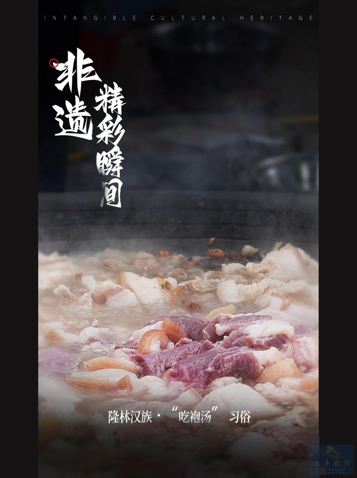在这里吃一碗“隆林限定”袍汤:主角就是这碗“袍汤”!用本地土猪的各个部位和内脏,加入八角、桂皮等香料与排骨一起熬煮,再下入豆腐、豆芽…汤色清亮却滋味浓郁,一碗下肚,浑身都暖了。这才是冬天里,最扎实、最乡土的“温暖”!