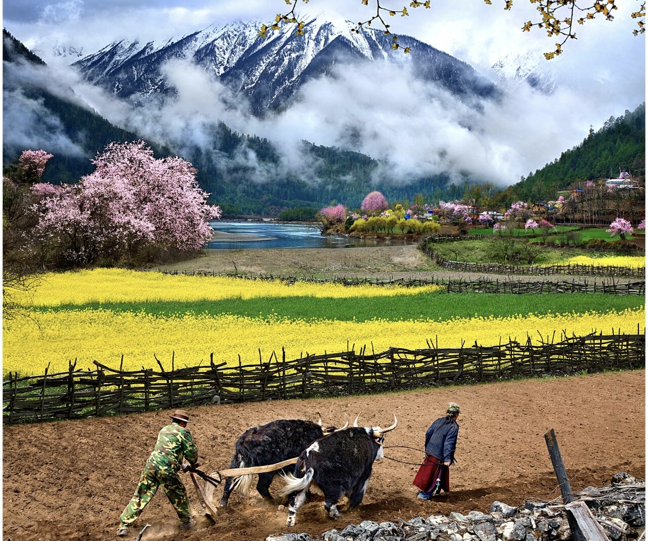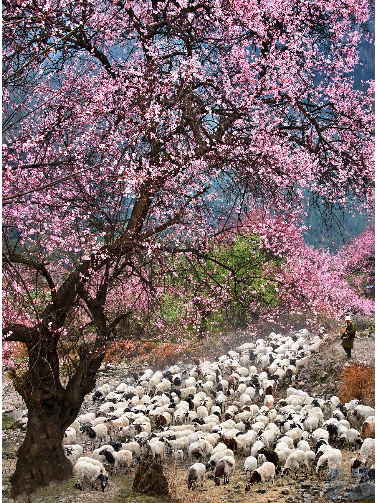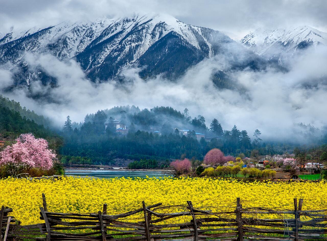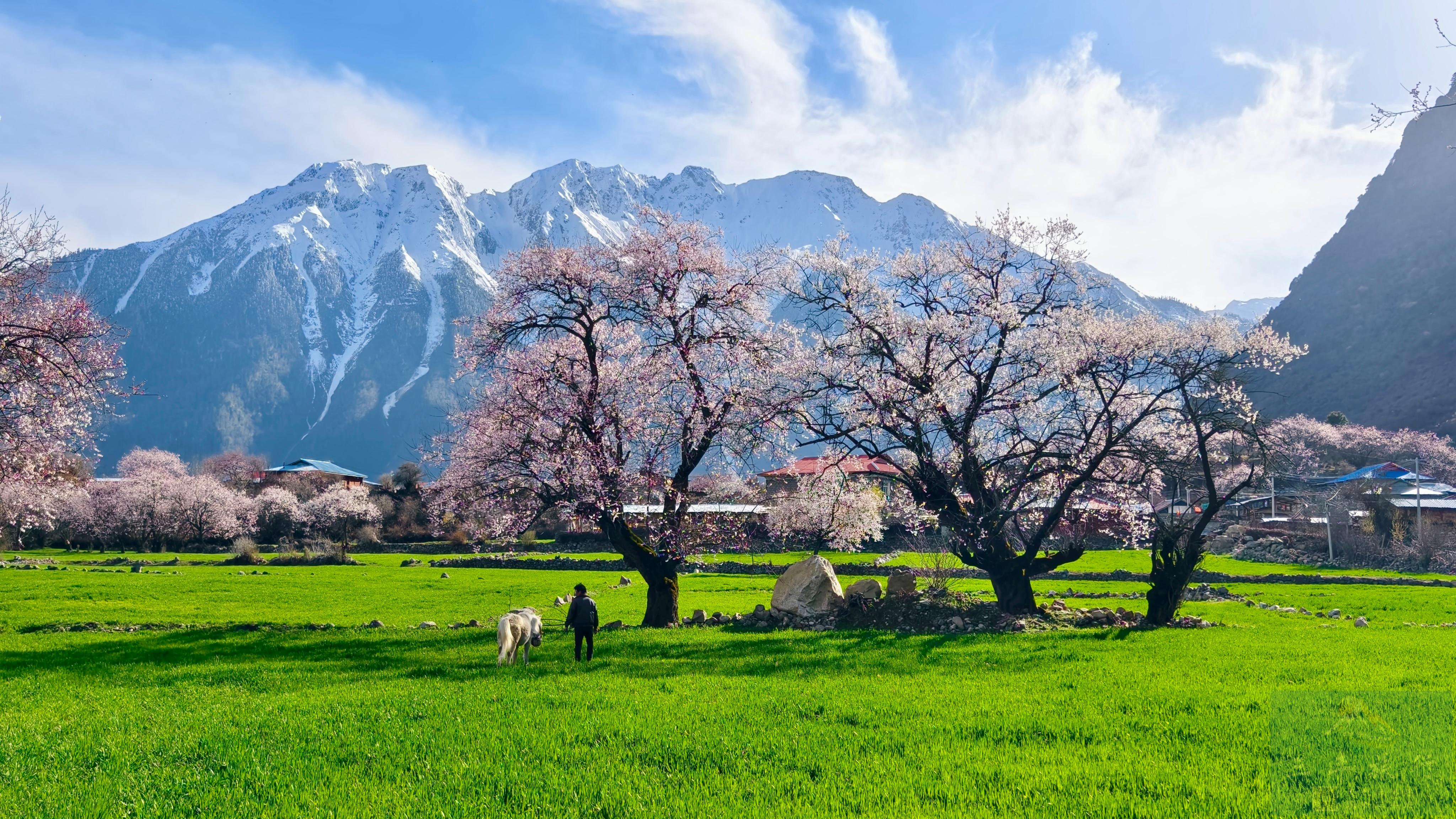 脚下是青青青稞田,身旁是潺潺溪流,藏式民居错落有致藏在桃花深处,春风拂过,花瓣纷飞,雪山静默矗立,没有人群打扰,只有花香、风声与雪山的寂静回响,这份清净又极致的美,才是藏地春天最该有的模样。