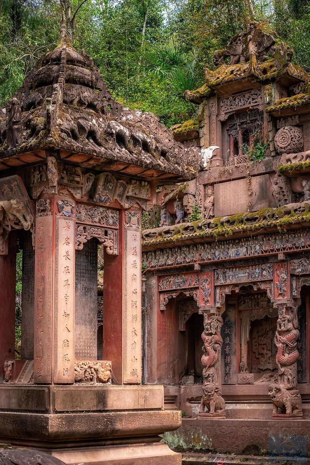 古建艺术天花板:川内罕见清末民初楼阁碑亭复合式墓葬,省级文保单位。7.5米高的五重檐庑殿式石构建筑,飞檐鸱吻、滚龙抱柱,连石狮都身披缨络,细节拉满。