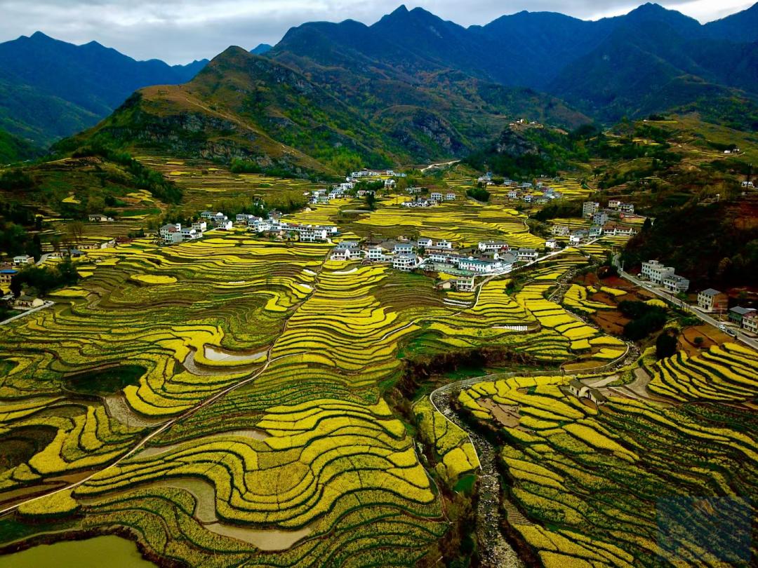 龙湾位于勉县元墩镇,一条小河绕山而过,形成了一个V型转弯。这里的油菜花地绵延,田地里还种植了一些标语,从高处往下俯瞰,不愧是一副壮丽秀美的画面!