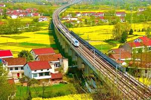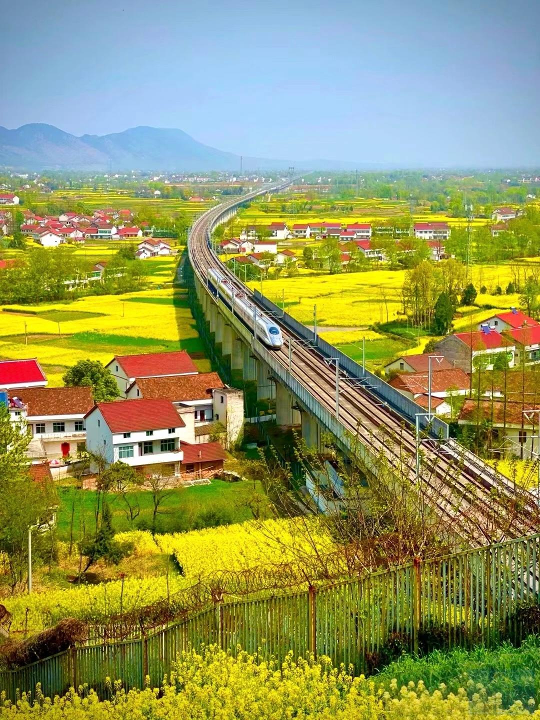 当南下的高铁穿过巍峨山脉行于油菜花遍地的大地画卷