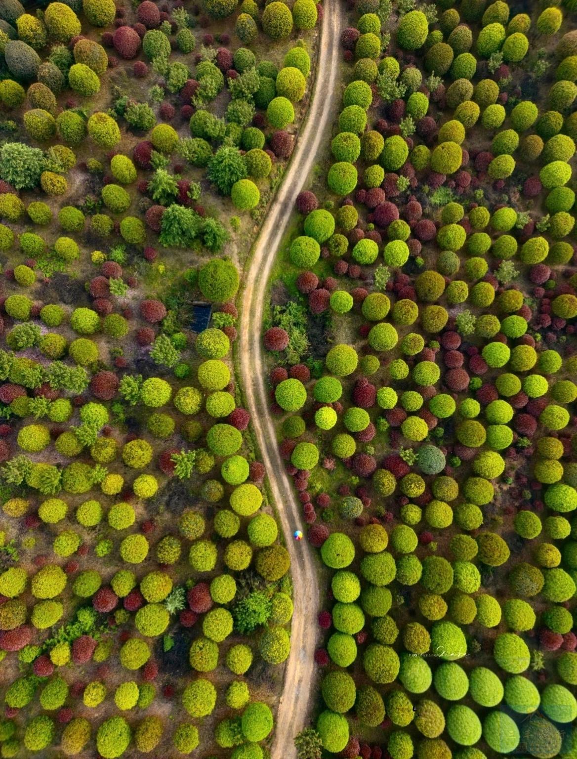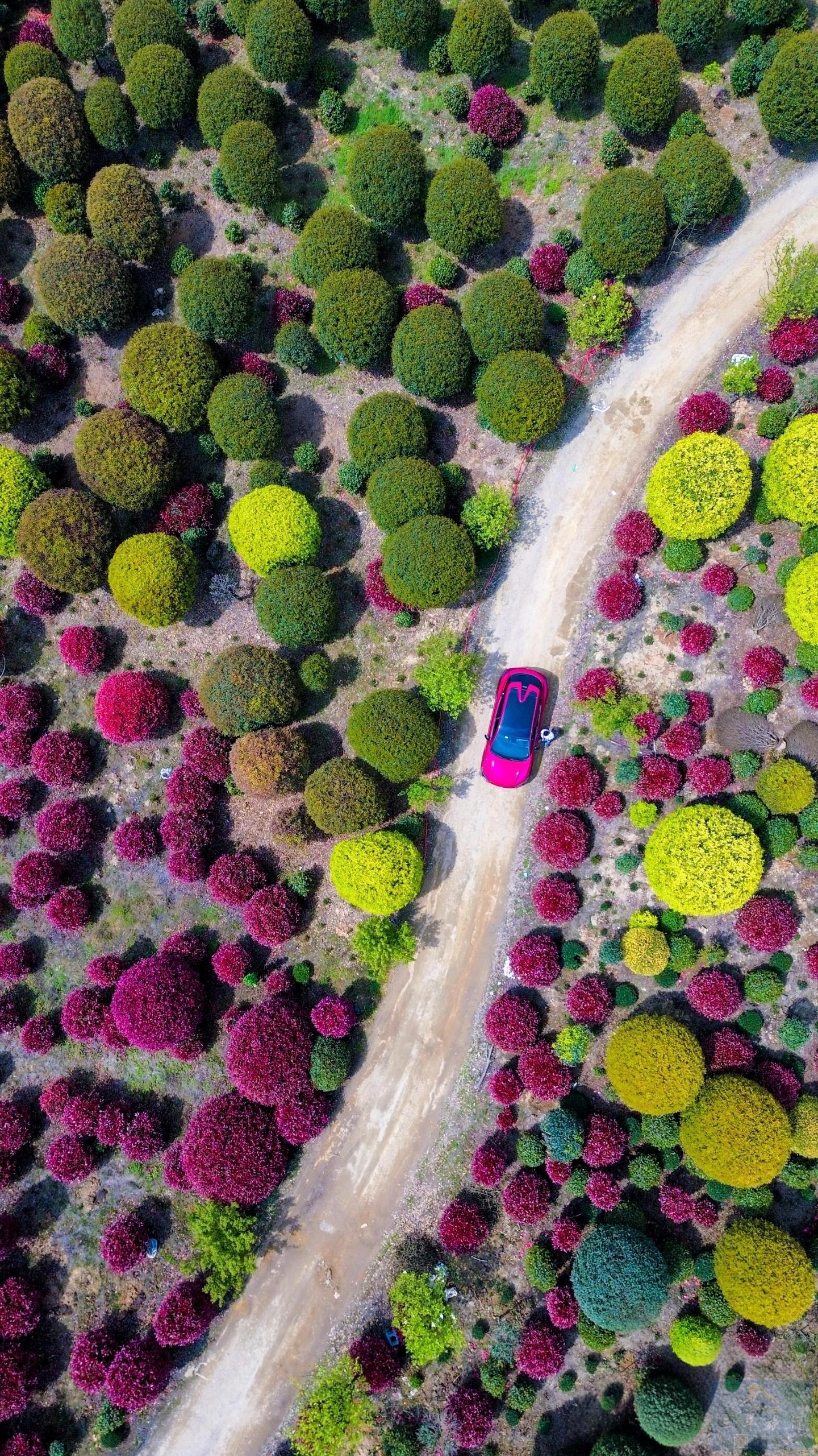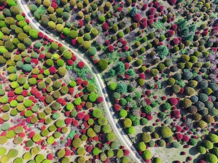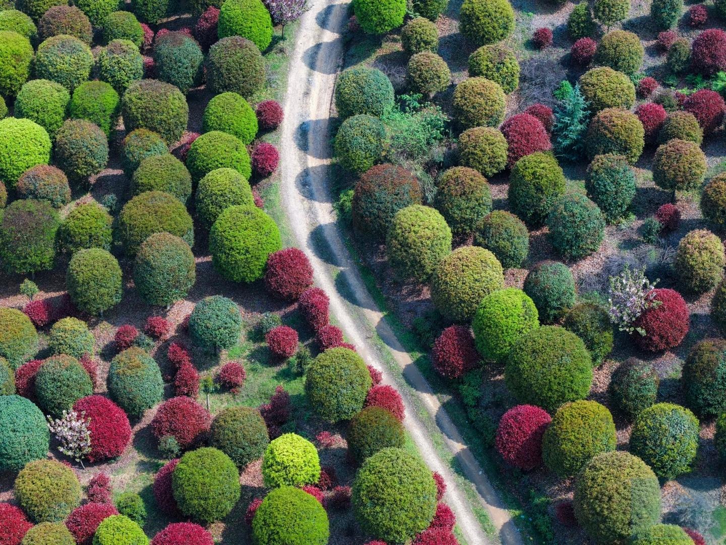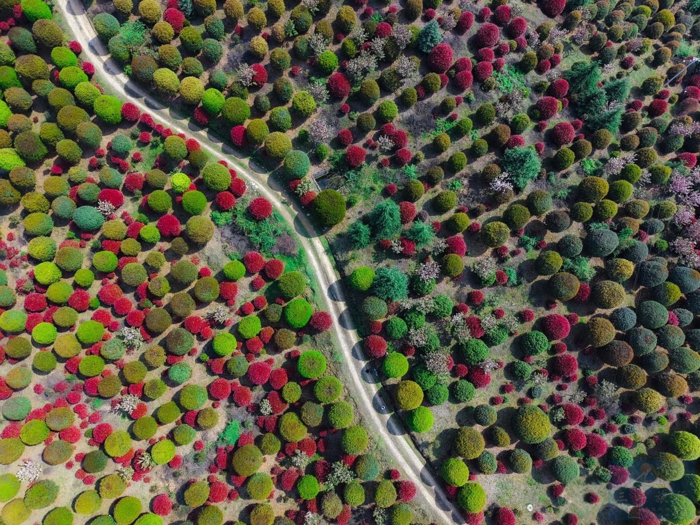 这里其实并不是真正的蘑菇,而是园艺场的球状圆形树啦,远看如同一树树圆润的大蘑菇,航拍视角下更显壮观,大片大片的树群排列整齐,规模宏大。