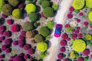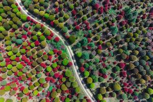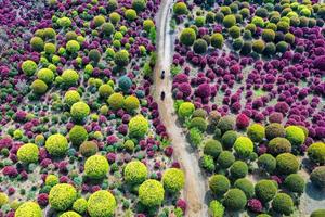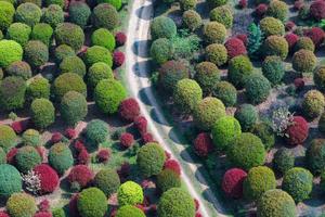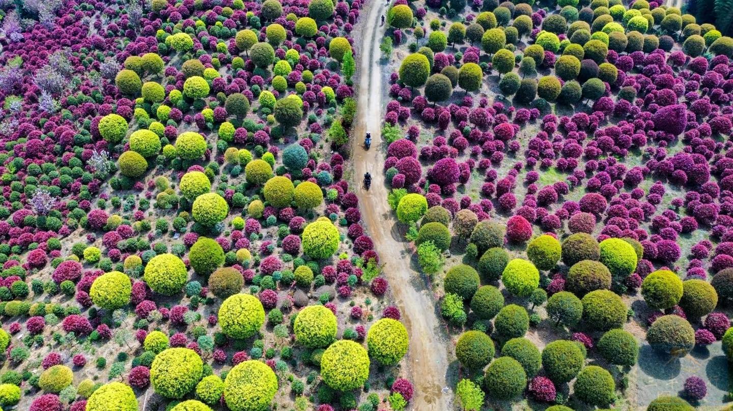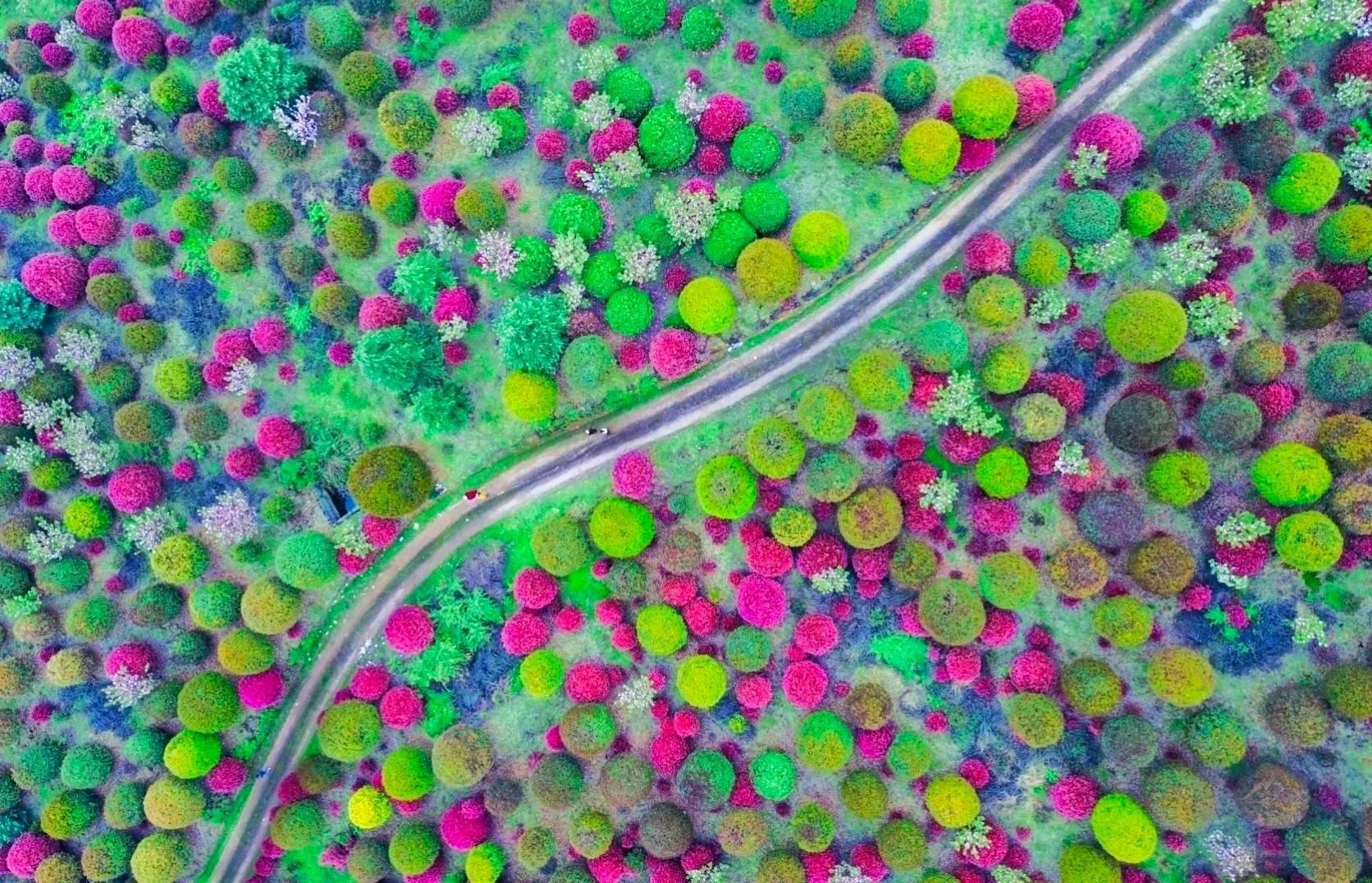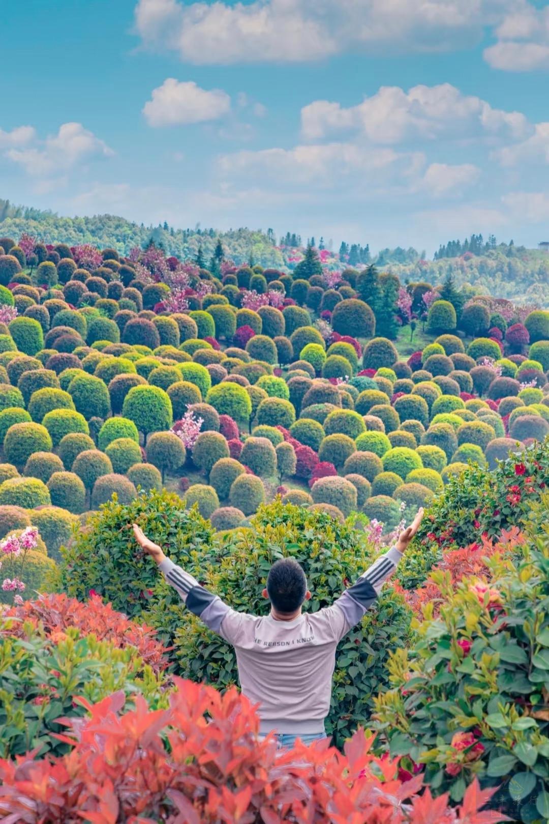 这里其实并不是真正的蘑菇,而是园艺场的球状圆形树啦,远看如同一树树圆润的大蘑菇,航拍视角下更显壮观,大片大片的树群排列整齐,规模宏大。