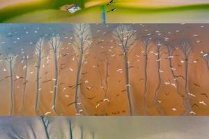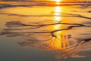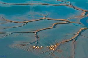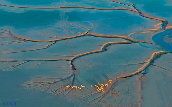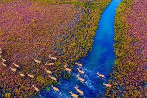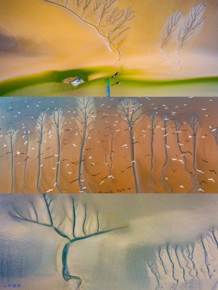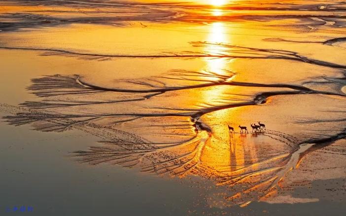 在中国江苏盐城大丰黄海野鹿荡,由于海水的涨潮退潮,在沿海滩涂上形成大量多姿多样的潮汐树。而此地野生的麋鹿,或成群结伴,或三三两两,或形单影只,在海边滩涂上自由自在地漫游,与潮汐树形成美妙的画面!